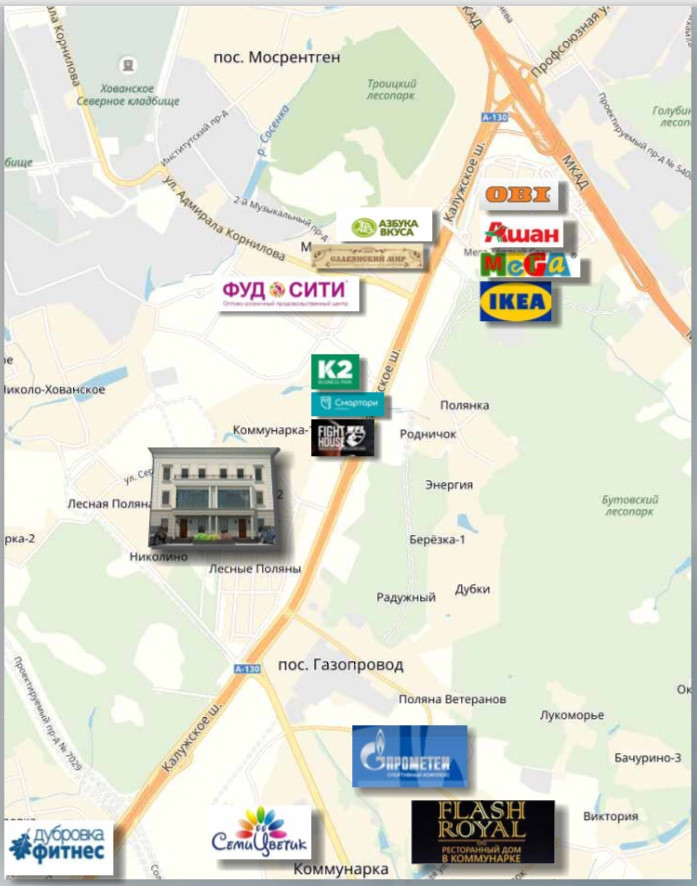 В шаговой доступности детский сад, школа и фитнес-клуб в бизнес центре К-2. В 5 мин на транспорте разнообразная городская инфраструктура ЖК Испанские кварталы и ЖК Дубровка, станции метро Ольховая и Прокшино.  В 2 км крупные ТЦ Мега, Спектр, Принц Плаза.