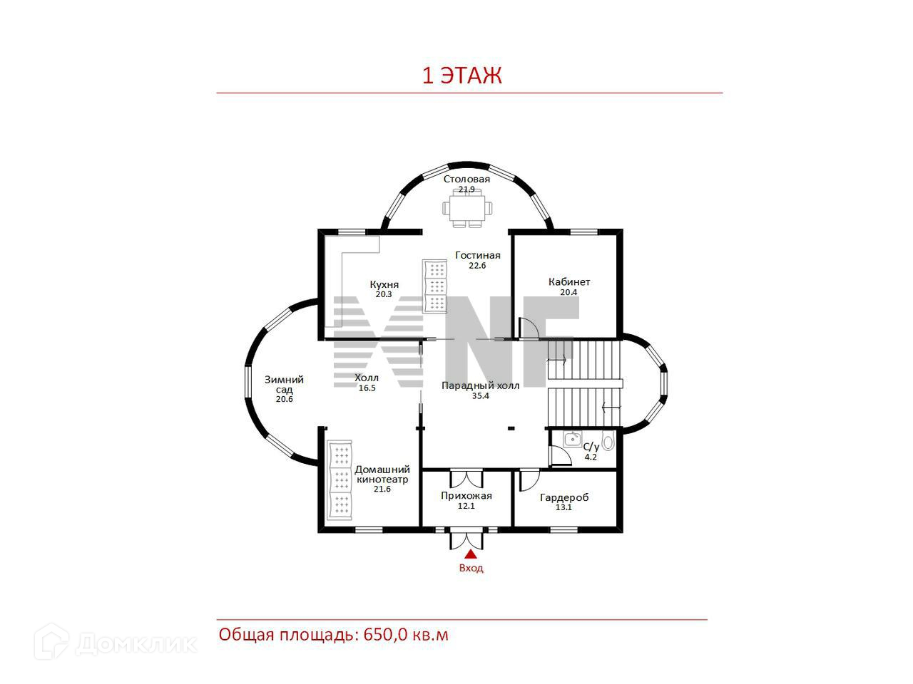 1 этаж: прихожая с диваном и гардеробной, холл, кабинет, гостиная, кухня, столовая, зимний сад, домашний кинотеатр, с/у, гардеробная;