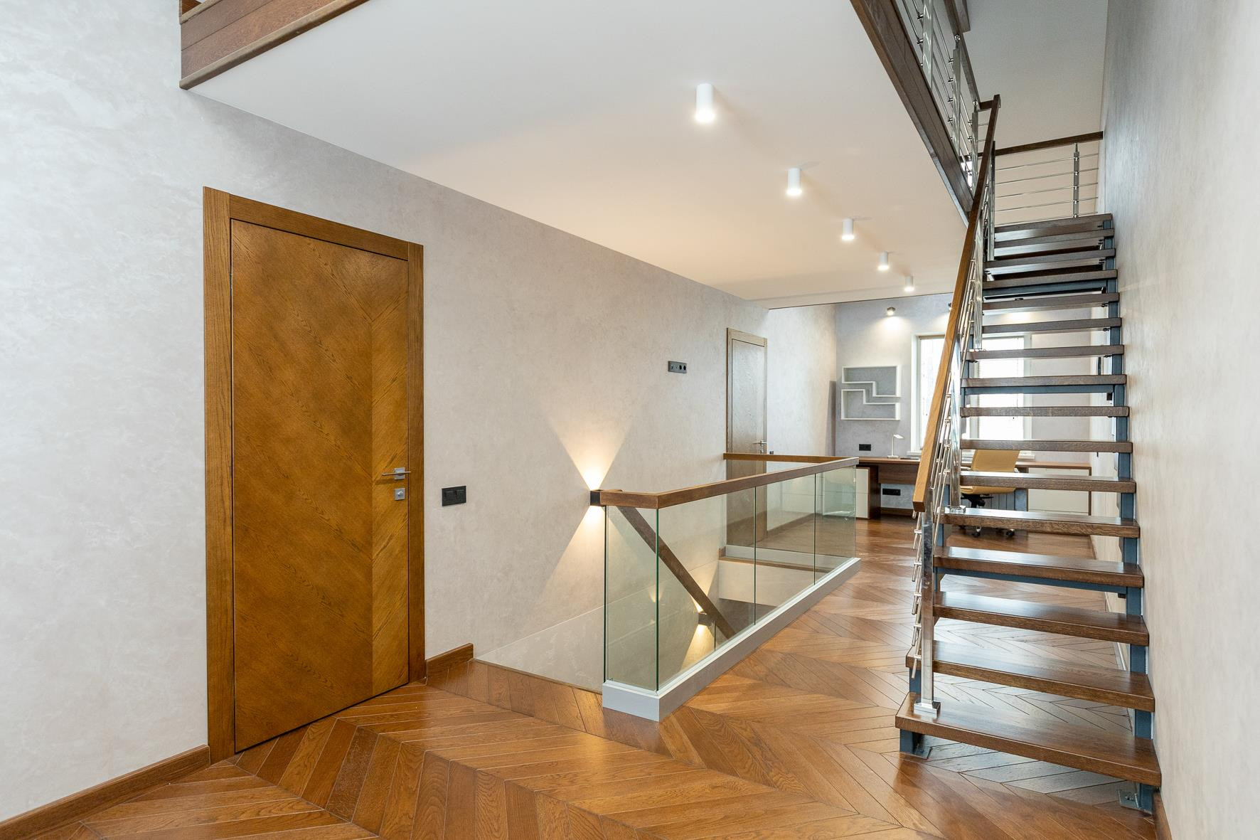 На первом и втором этажах выполнен теплый пол, на 3- и 4-м этажах паркетная доска.