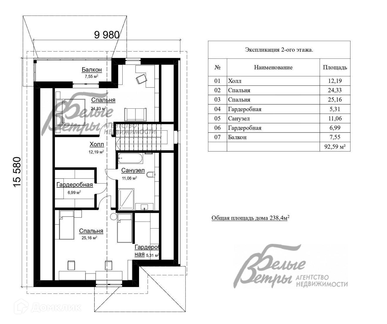 2-ой этаж: холл 12,19 кв.м, спальня 24,33 кв.м, спальня 25,16 кв.м, гардеробная 5,31 кв.м, санузел 11,1 кв.м, гардеробная 6,99 кв.м, балкон 7,55 кв.м..