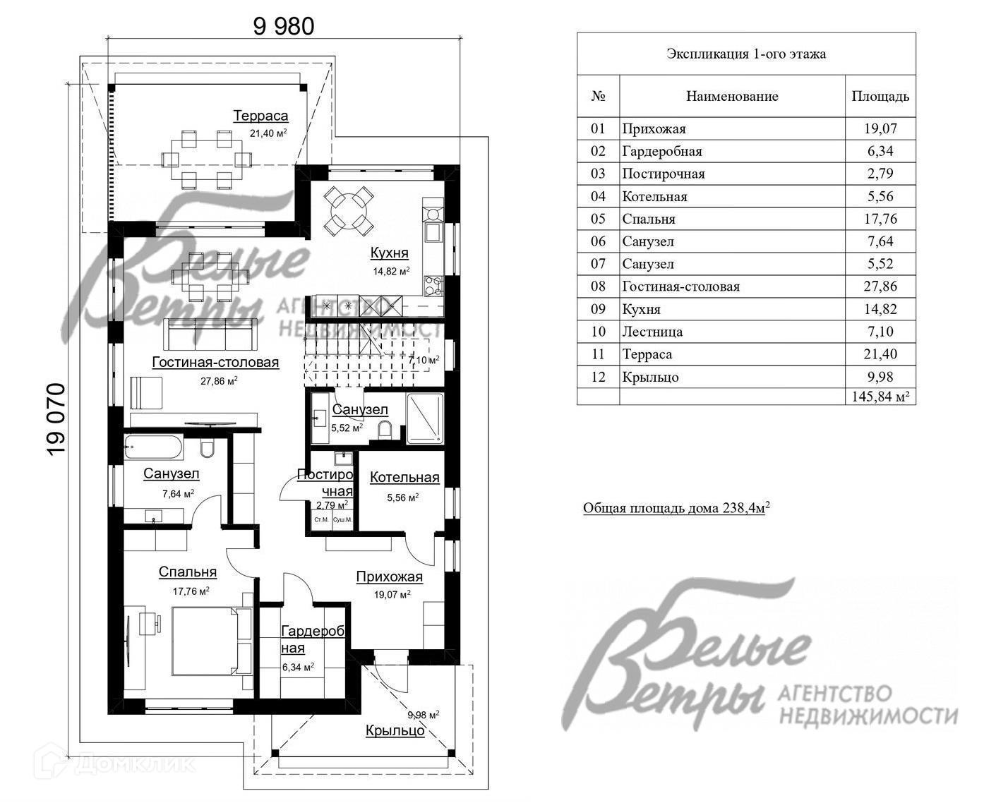 1-ый этаж: прихожая 19,07 кв.м, гардеробная 6,34 кв.м, постирочная 2,79 кв.м, котельная 5,56 кв.м, спальня 17,76 кв.м, санузел 7,64 кв.м, санузел 5,52 кв.м, гостиная-столовая 27,86 кв.м, кухня 14,82 кв.м, лестница 7,1 кв.м, терраса 21,4 кв.м, крыльцо 9,98 кв.м..