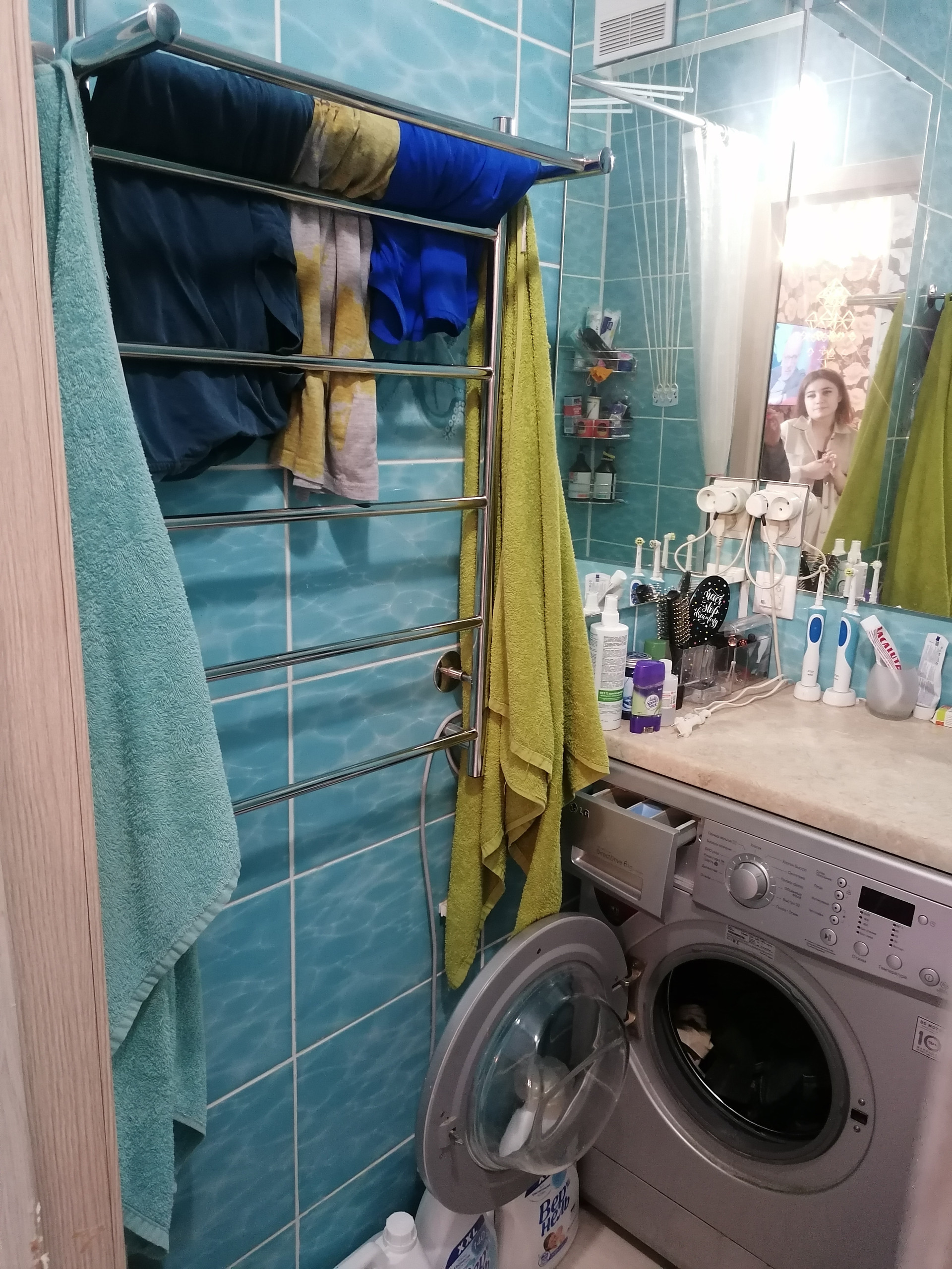 В туалете линолеум, в ванне плитка ( теплый пол).,полотенцесушитель электрический, новая чугунная ванна.Вытяжки с вентиляцией в туалете и ванне.