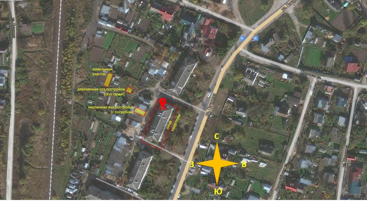 Кирпичная хозпостройка, у входа в подъезд; с забетонированным погребом. Деревянная хозпостройка, у земельного участка; имеет хороший и всегда очищаемый зимой подъезд; отличная площадь для парковки авто-/строительства гаража.