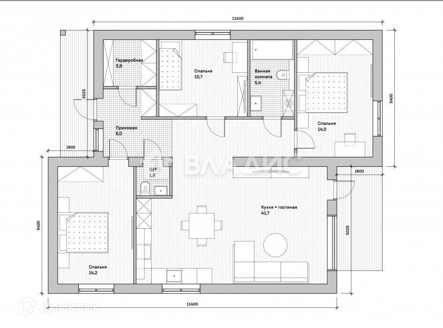 Планировка: кухня гостиная с панорамными окнами и выходом на террасу 41.7 кв.м., 3 спальни 14 кв.м., 14 кв.м. и 11 кв.м., 2 санузла 7,6 кв.м. и 1,9 кв.м, гардеробная 3,7 кв.м., прихожая 12.4 кв.м