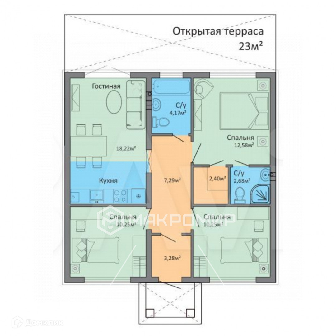 - кухня-гостиная 19 кв.м с выходом на террасу 23 кв.м;
