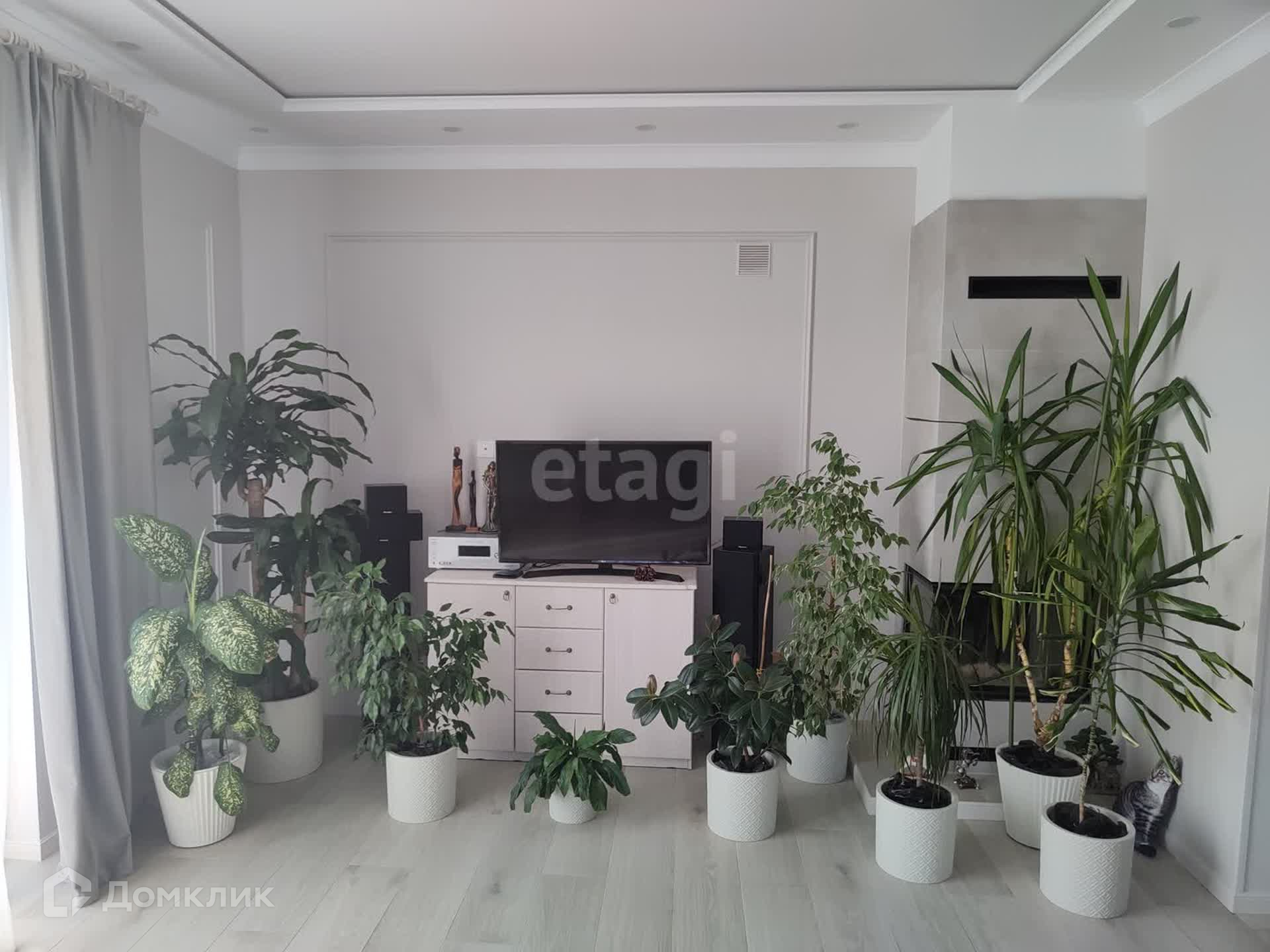 На 1-м этаже расположена кухня-гостиная с камином, совмещенный санузел, душевая, котельная, гардеробная комната, кладовая. Теплый пол с кафелем. Потолки двухуровневые, комбинированные.