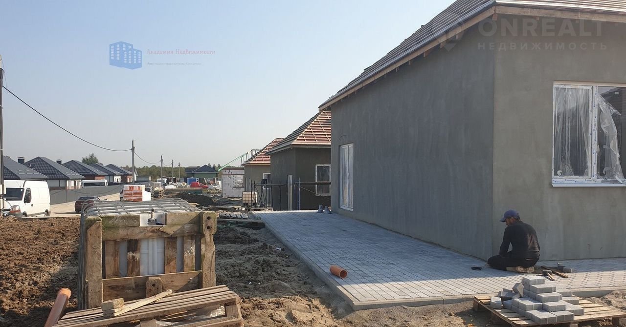 Участок благоустроен, на участке предусмотрена терраса (20 м2) и парковочное место, все вымощено плиткой. Участок огорожен и засеян травой.