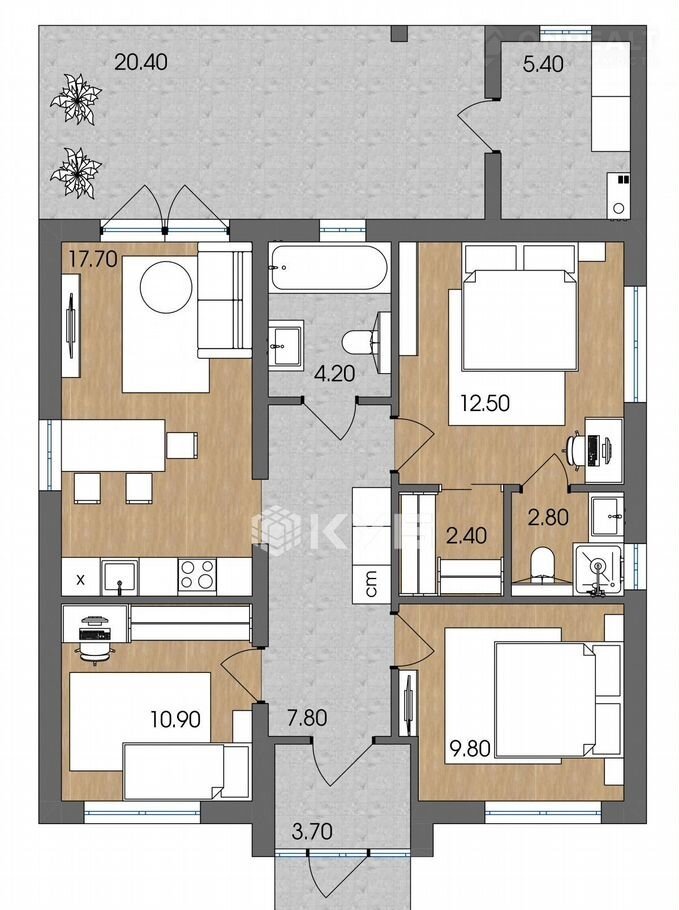 - Дом имеет просторную кухню-гостиную 17.7 м2, мастер-спальню (хозяйская) с гардеробной и санузлом, две обычных спальни, ванную комнату, большую террасу 20.4 м2.