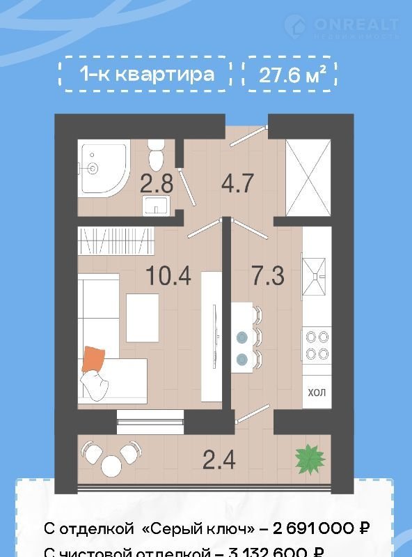 Общая площадь 27.6 м2