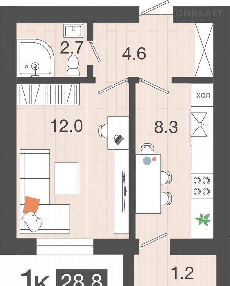 Общая площадь 28.8 м2