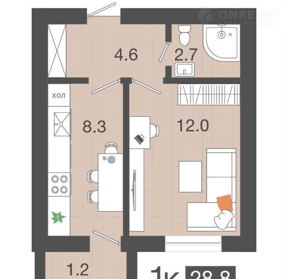Общая площадь 28.8 м2