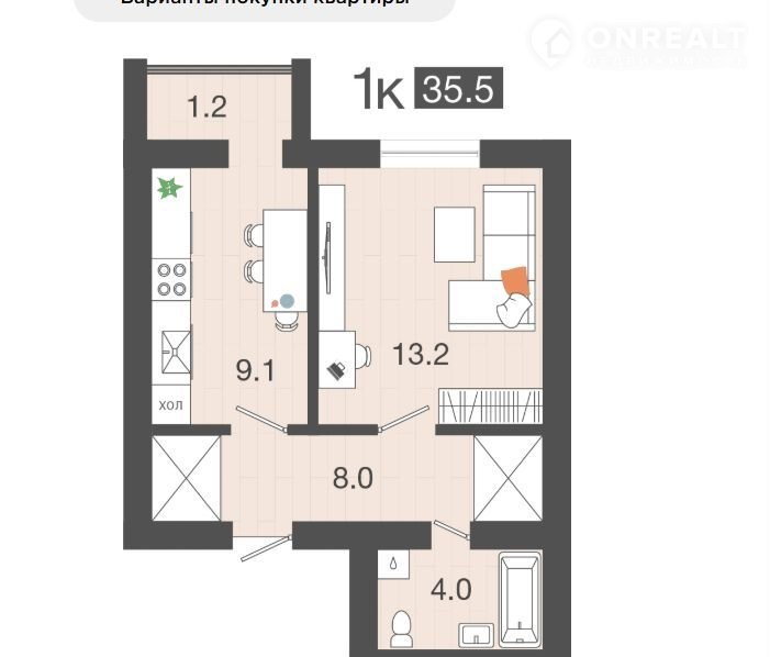 Общая площадь 35.5 м2