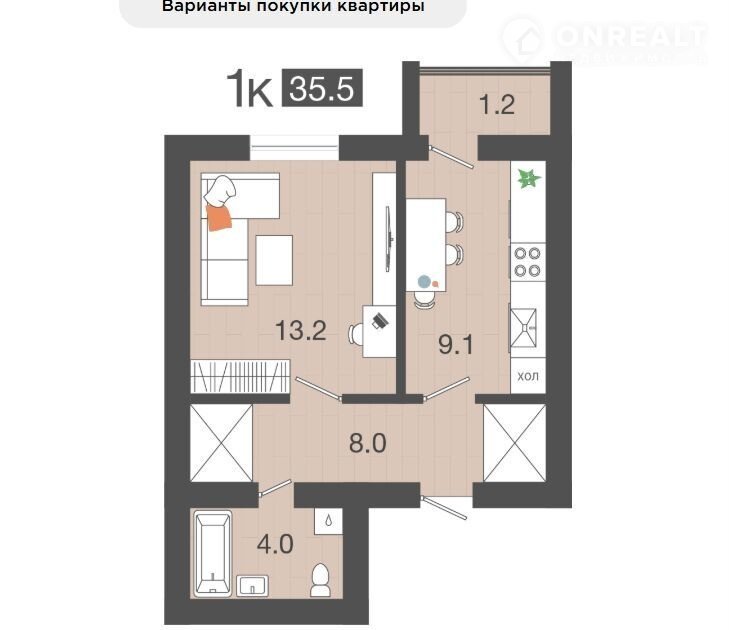 Общая площадь 35.5 м2