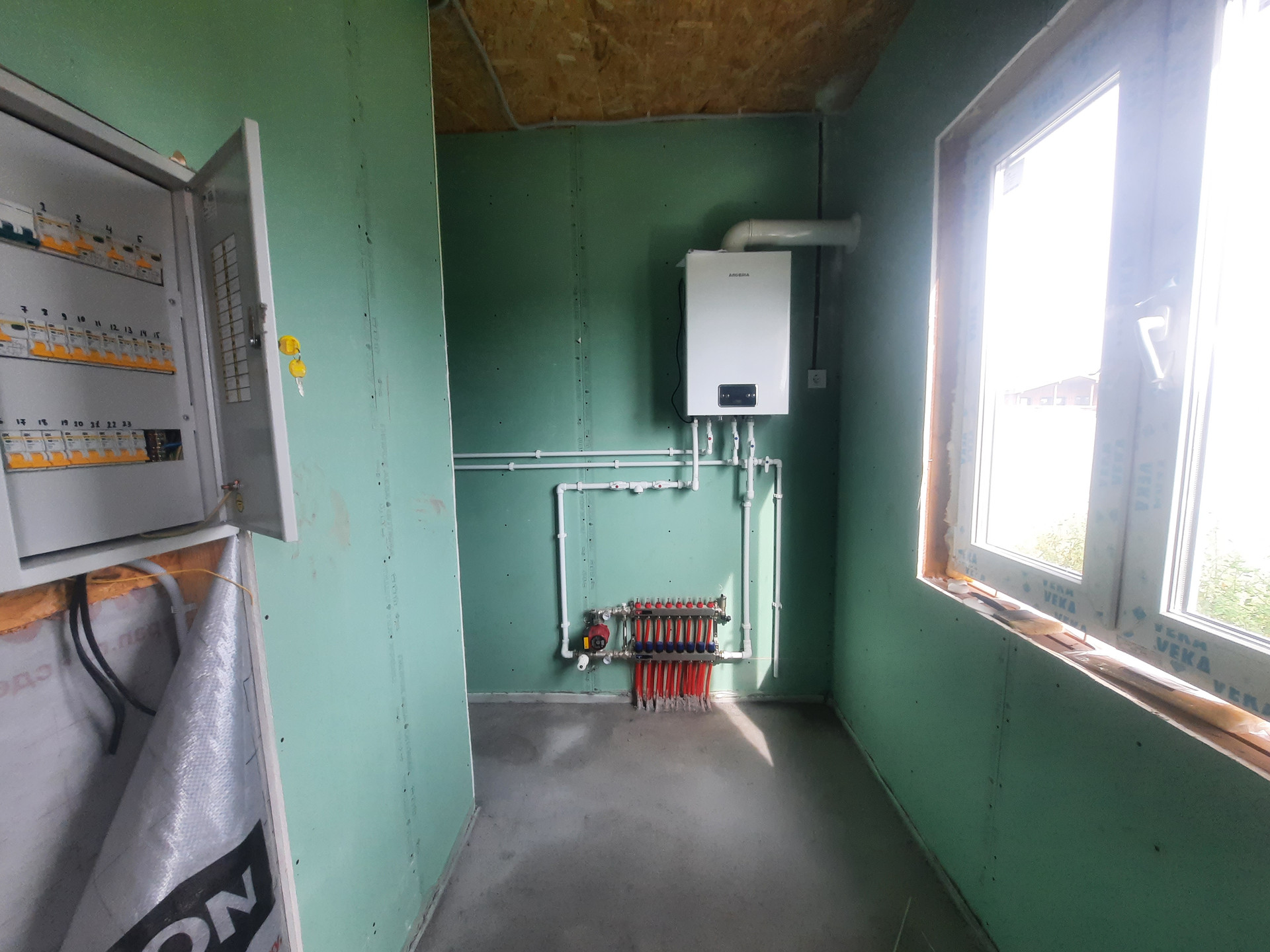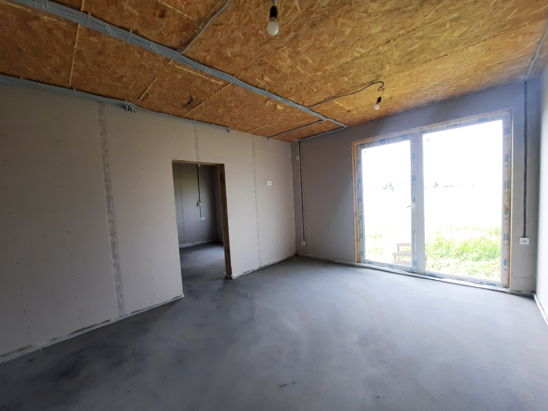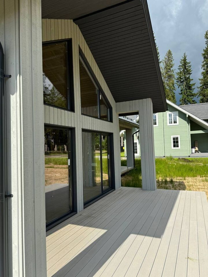 Дом в предчистовой отделке: разведены все коммуникации (отопление: водяной тёплый пол, электричество, вода). Стены обшиты гипсокартоном. Установлены: септик, дверь с терморазрывом, кашированные окна, кровля, фасад.