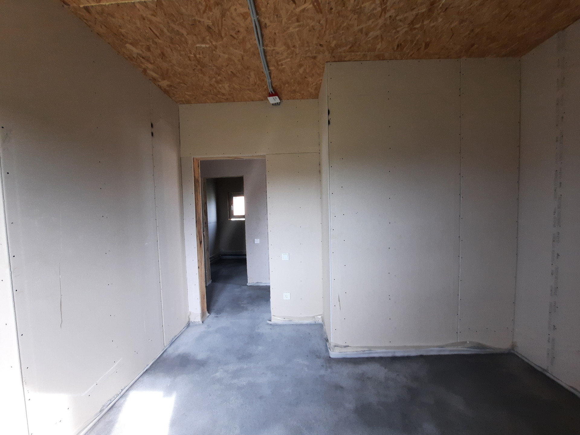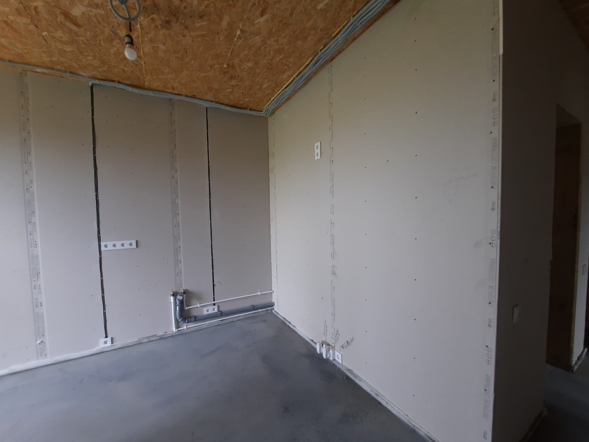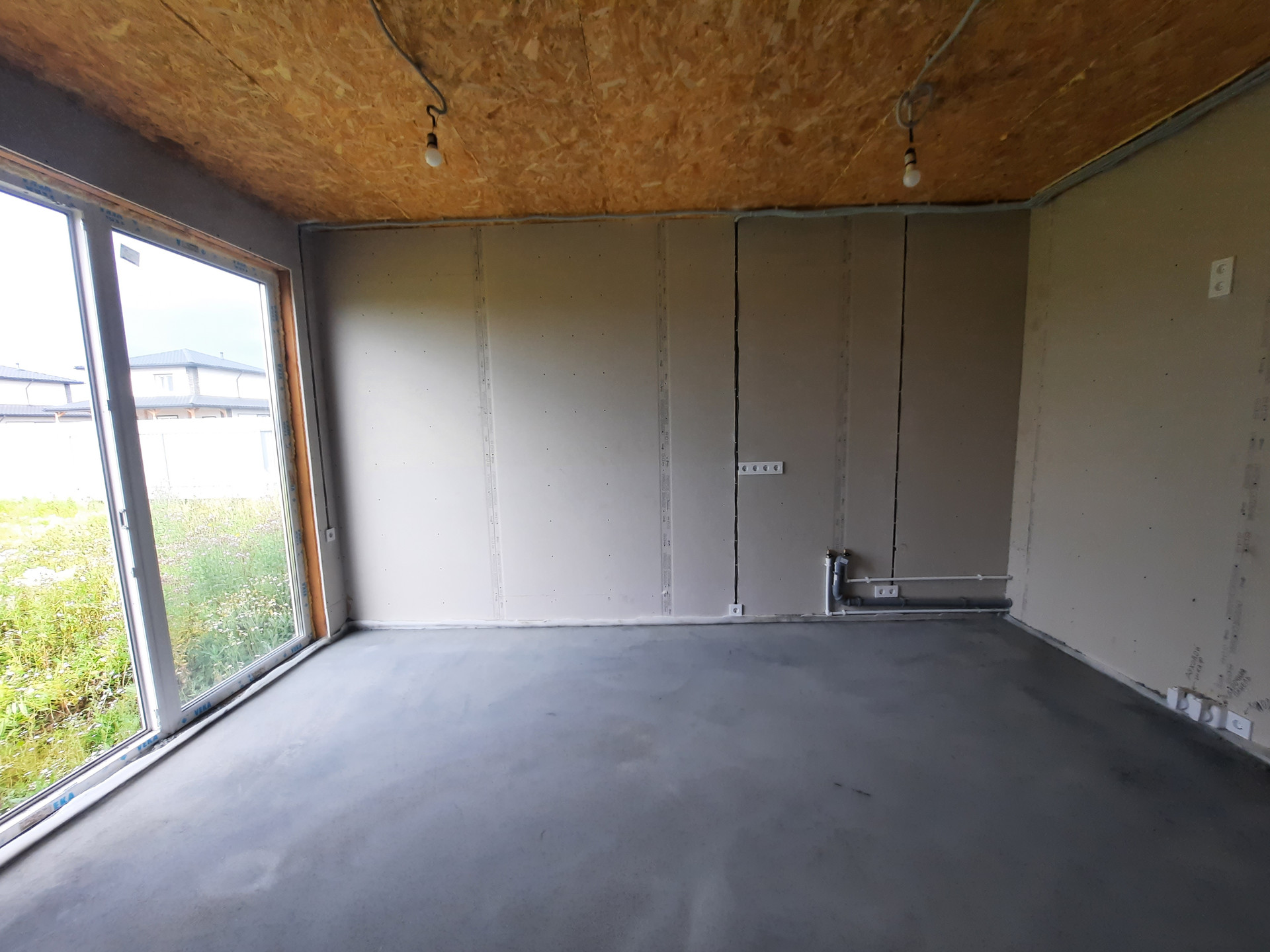 Дом в предчистовой отделке: разведены все коммуникации (отопление: водяной тёплый пол, электричество, вода). Стены обшиты гипсокартоном. Установлены: септик, дверь с терморазрывом, кашированные окна, кровля, фасад.