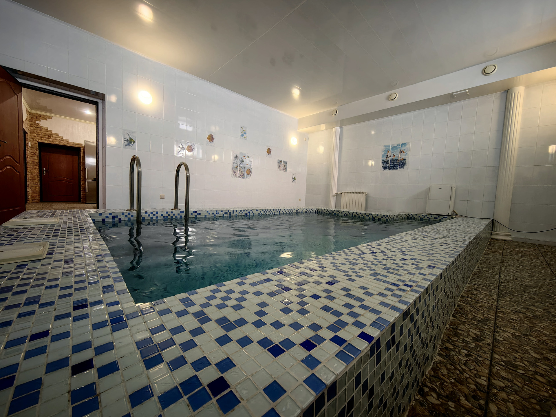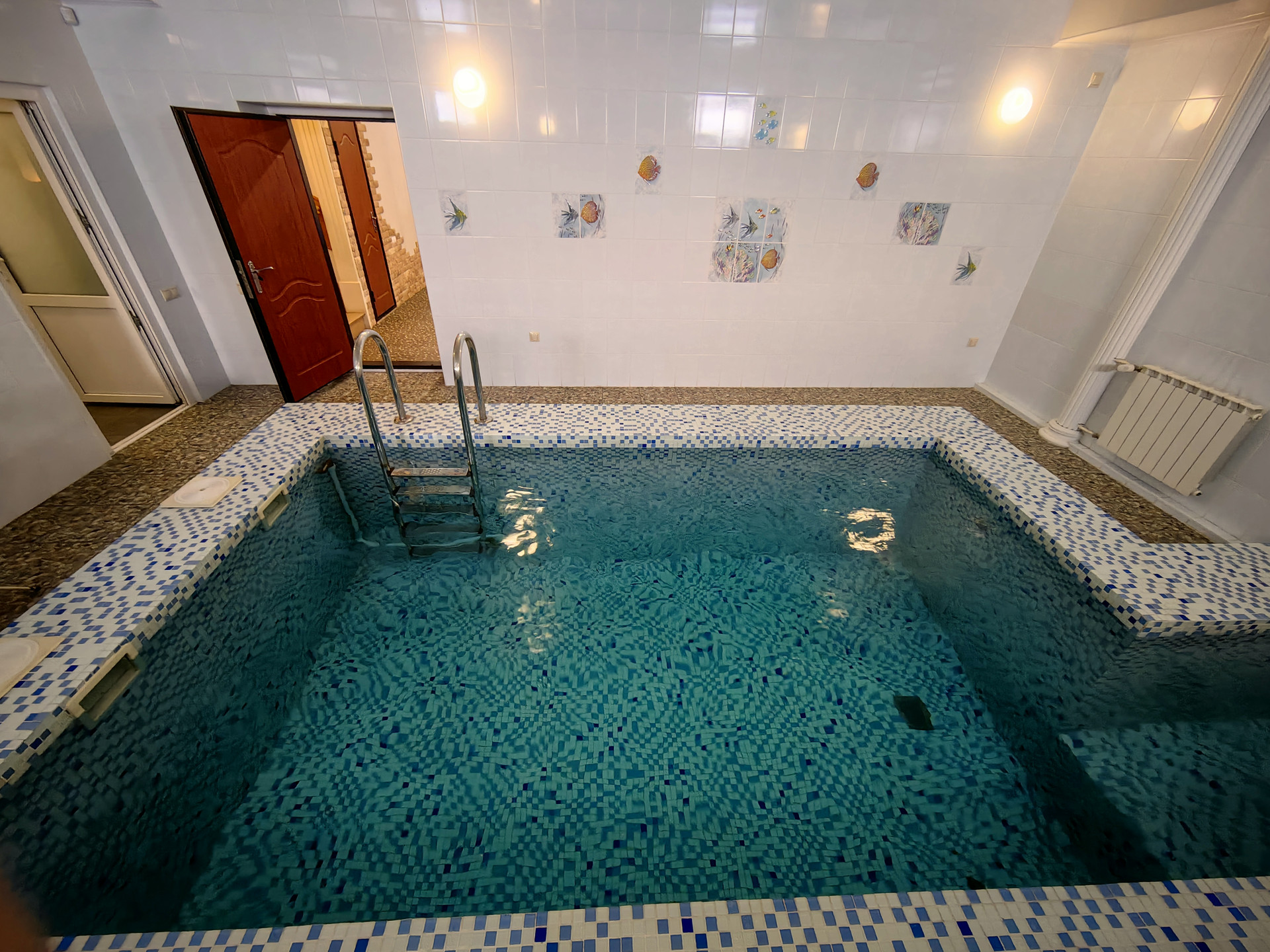 Очень удобный, идеально чистый бассейн 2,5х5,5м, глубина 1,8м и 1,0м (детская зона) с подогревом от газовой котельной, очисткой и фильтрацией. В помещении бассейна установлен сушитель воздуха; приточная система вентиляции с подогревом , вытяжная система вентиляции. Полы теплые с подогревом.