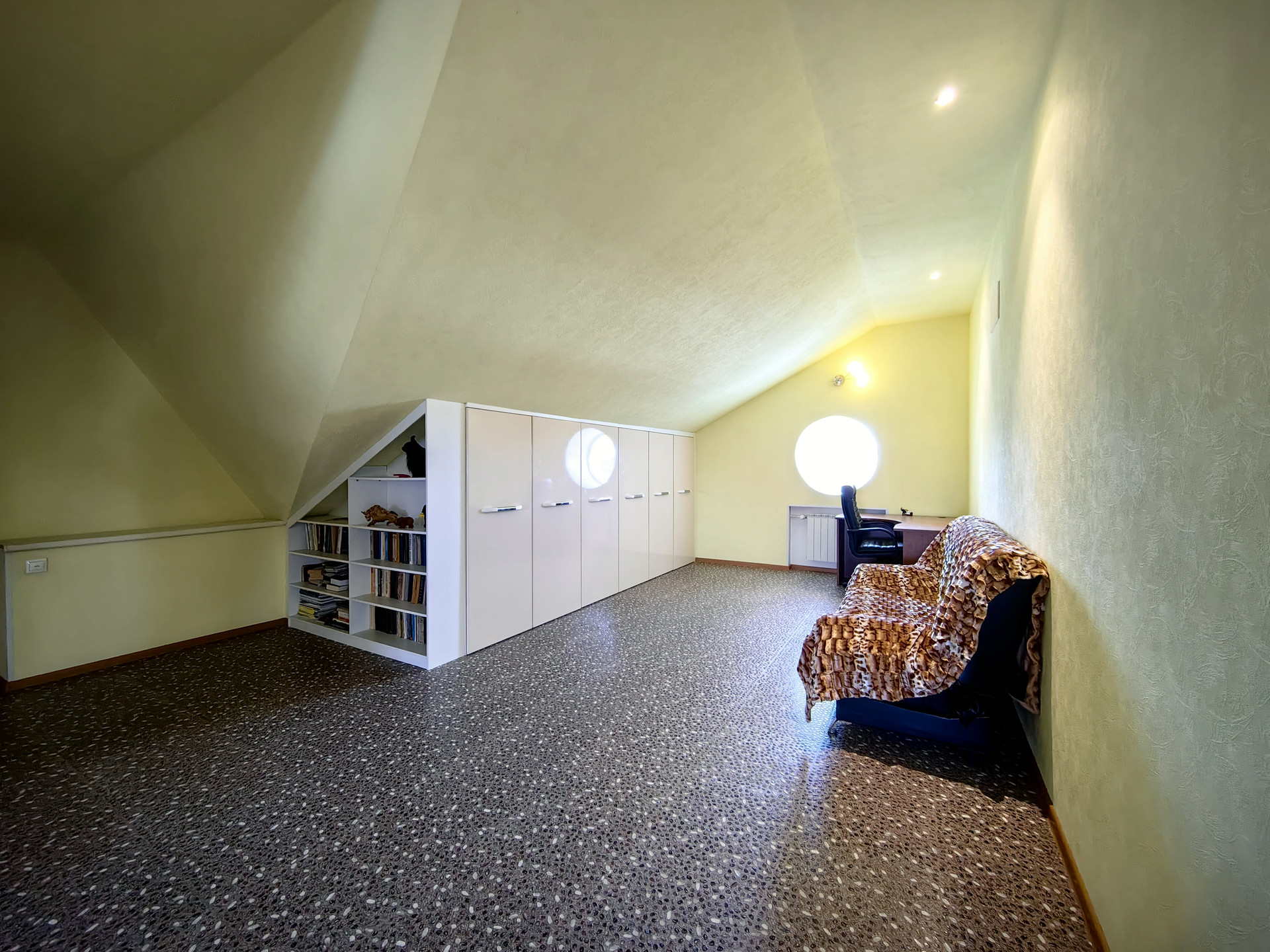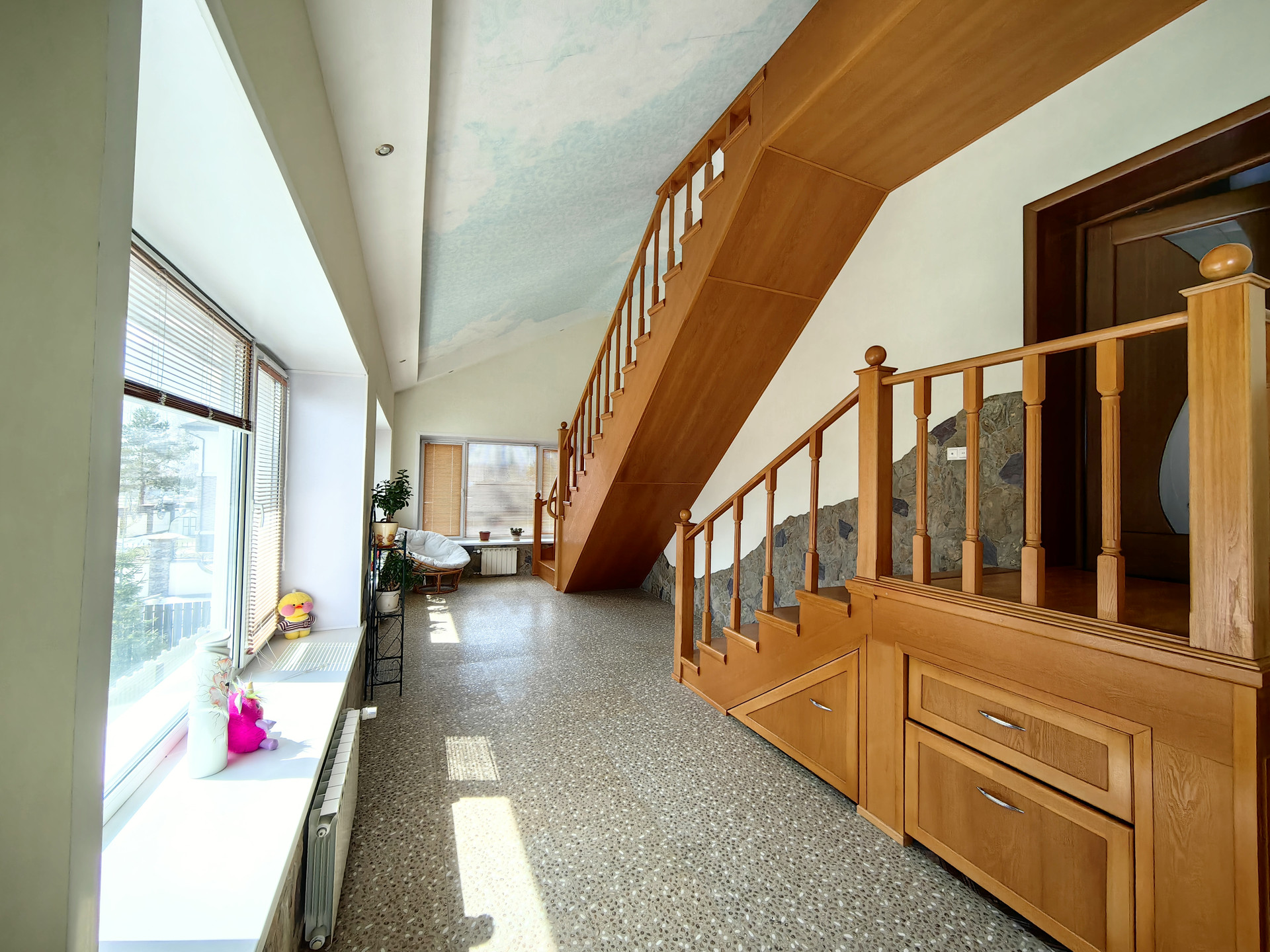 На втором этаже расположены зал с зоной отдыха, на полу пробковое покрытие.