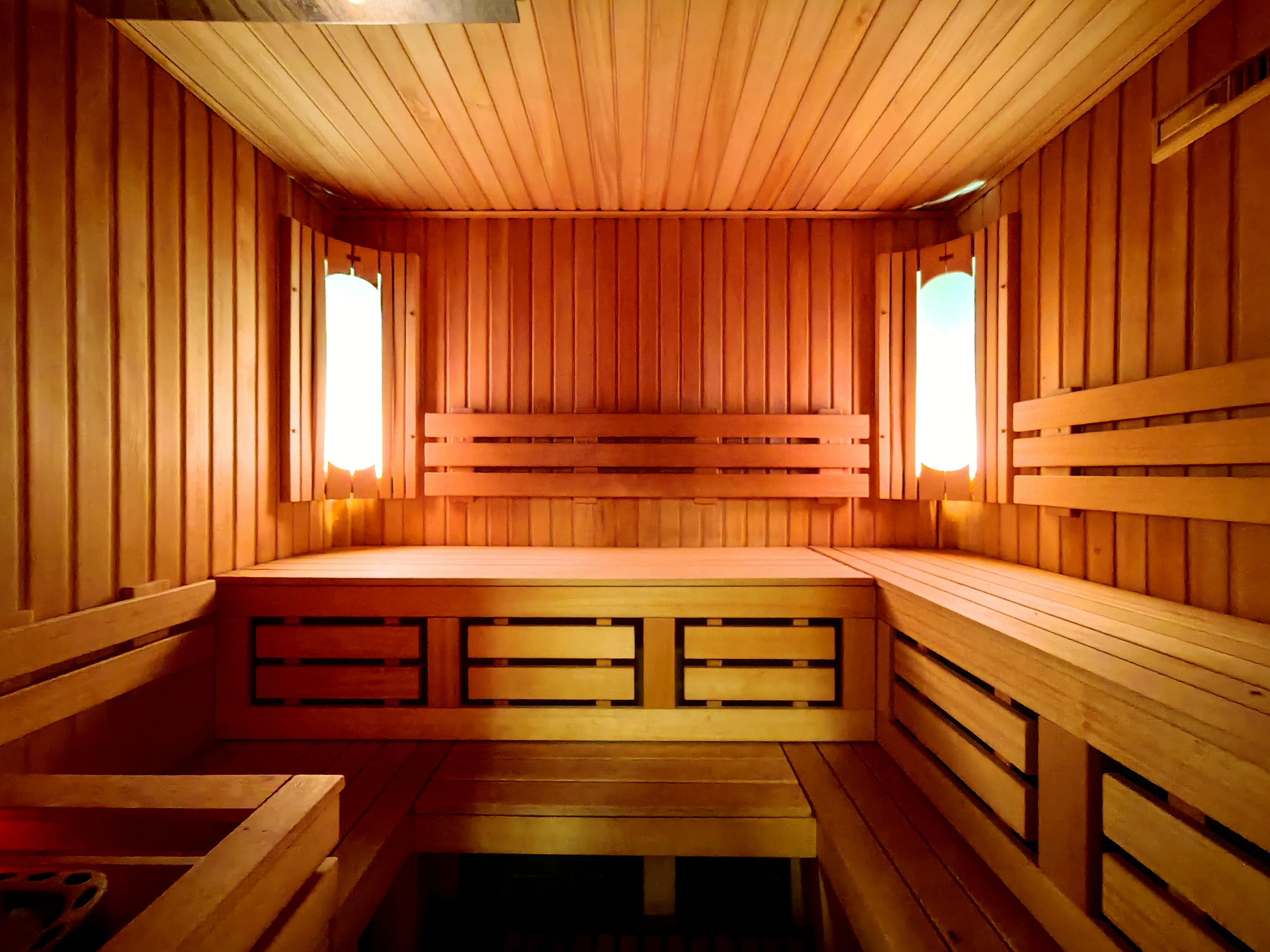 Электрическая сауна – установлена финская печь, полки и стены из древесины абаша.