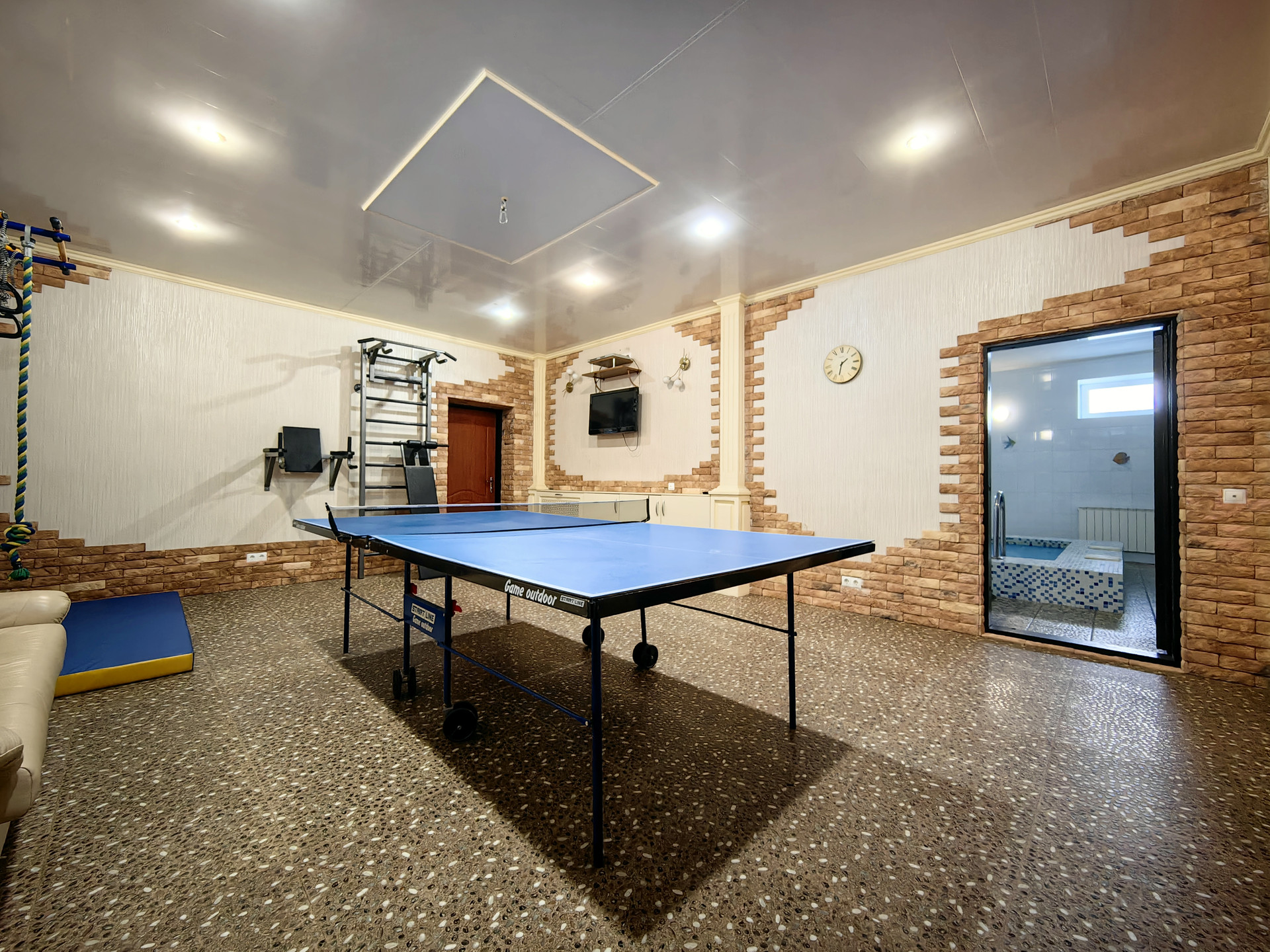 На цокольном этаже расположен тренажерный зал со спортивными сооружениями и теннисным столом.