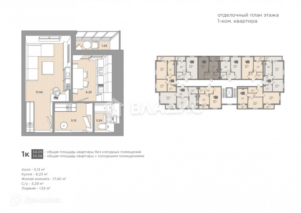 комната 17,4 кв м, кухня 8,23 кв. м, коридор 5,13 кв м, санузел 3,29 кв м, остекленная лоджия 1,53 кв м.