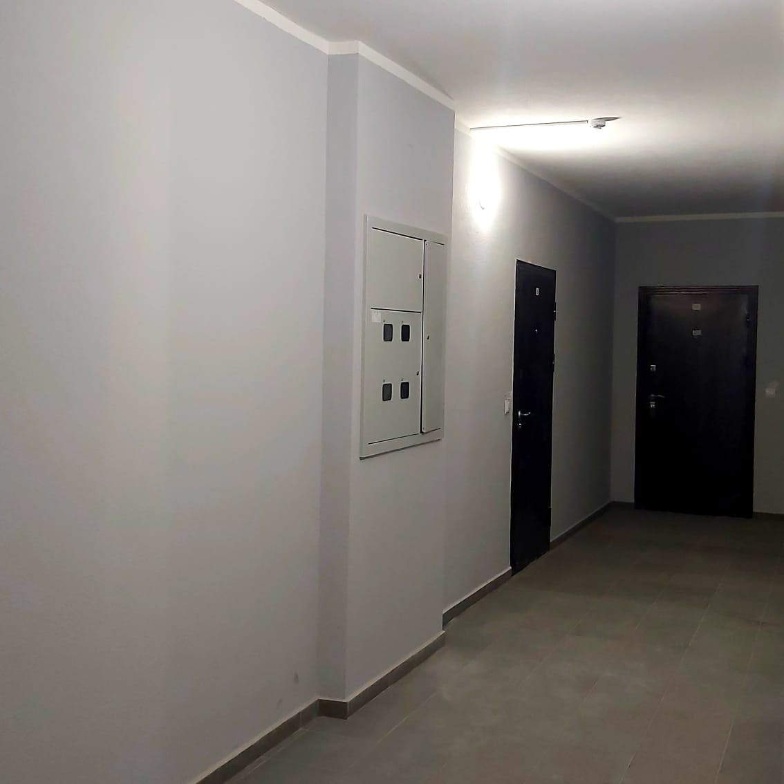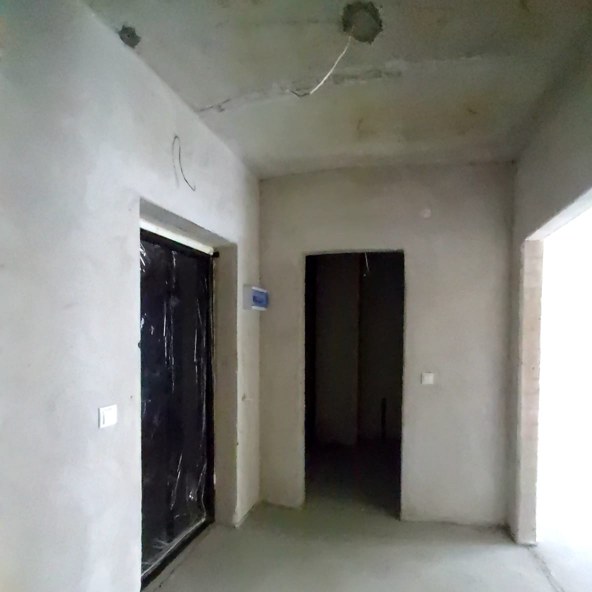 Выполнена предчистовая отделка, установлены розетки и выключатели, радиаторы, в ванной –полотенцесушитель.