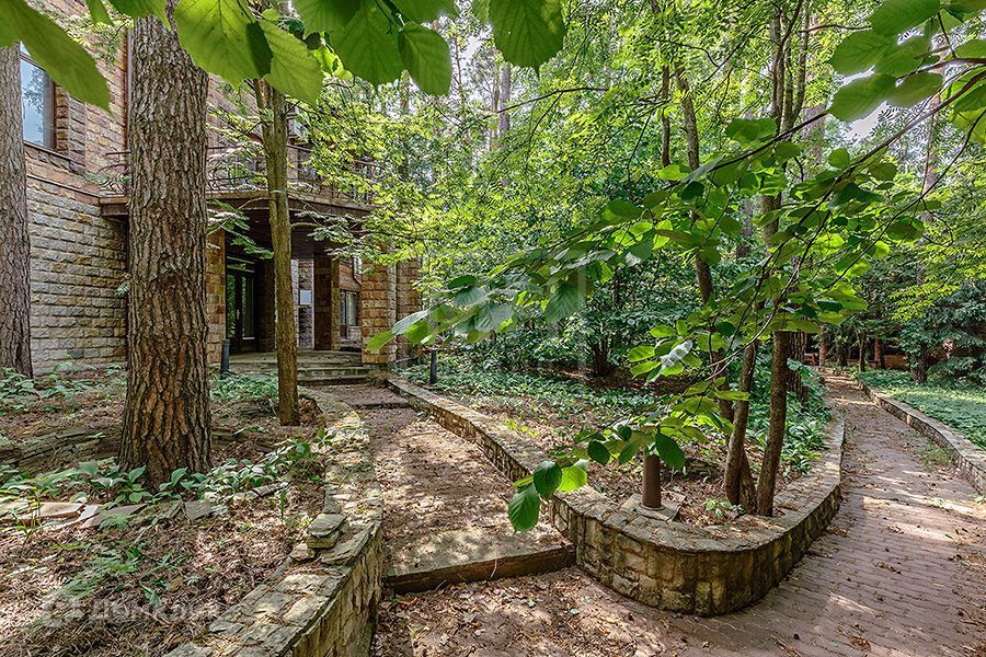 Участок с перепадами высот, вымощены дорожки, установлено освещение.