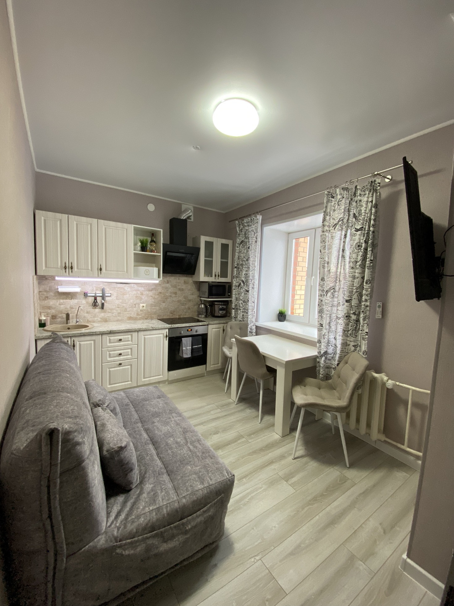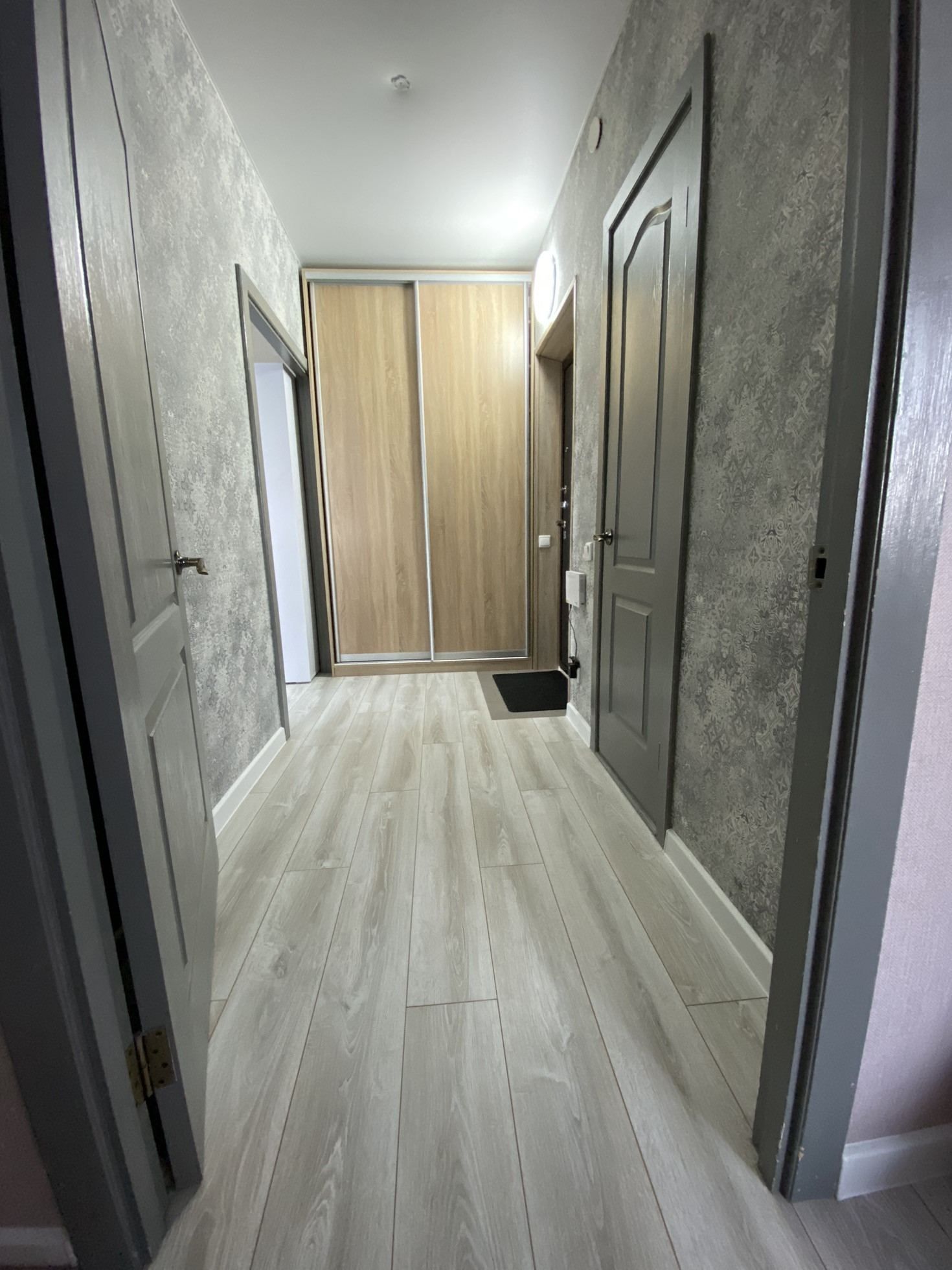 Ремонт во всех помещениях: в ванной плитка на стенах и полу, в кухне и комнате новые современные обои, ламинат во всей квартире, натяжной потолок. В прихожей встроенный шкаф купе. Остаются шкаф и кухня.