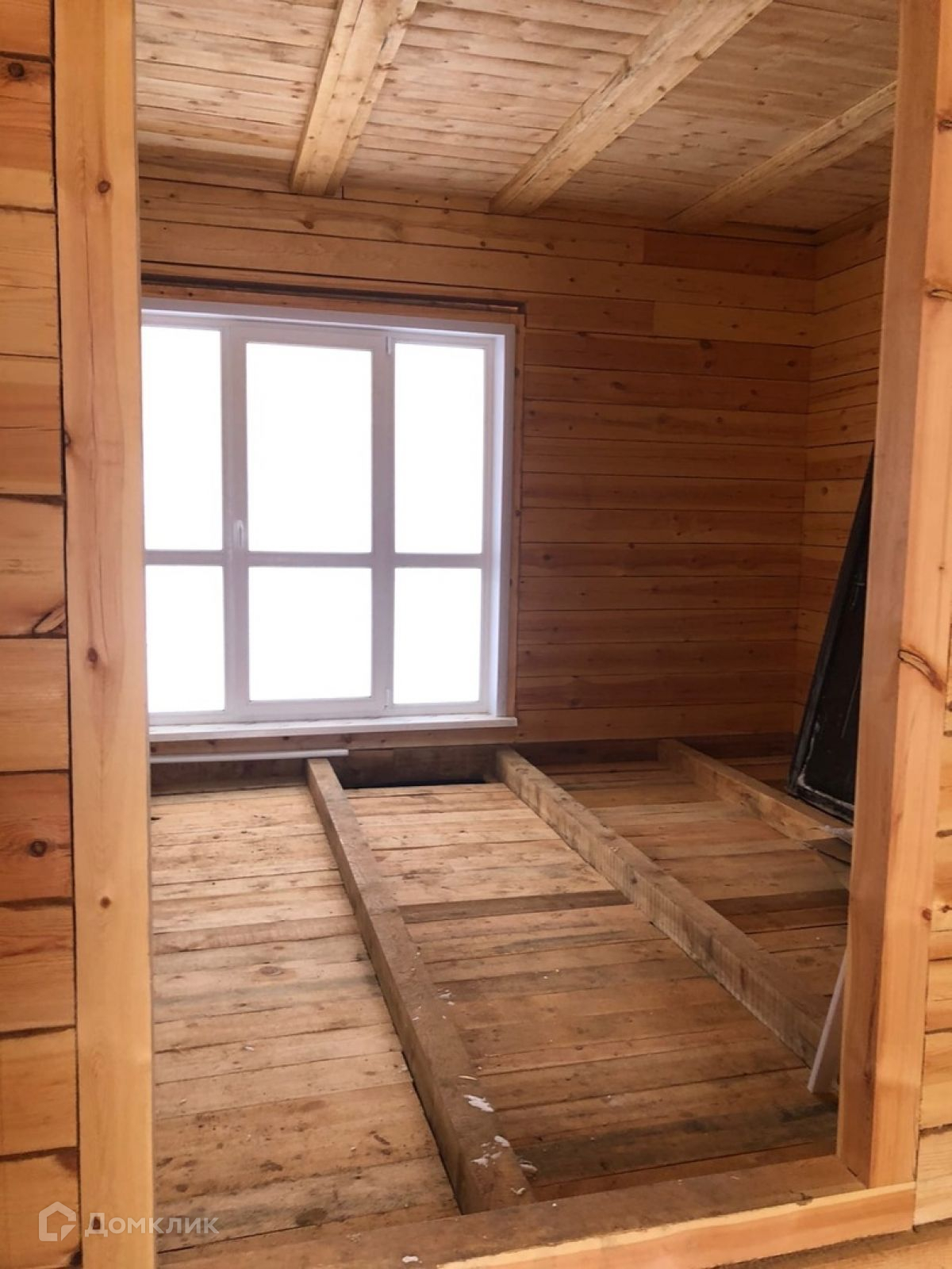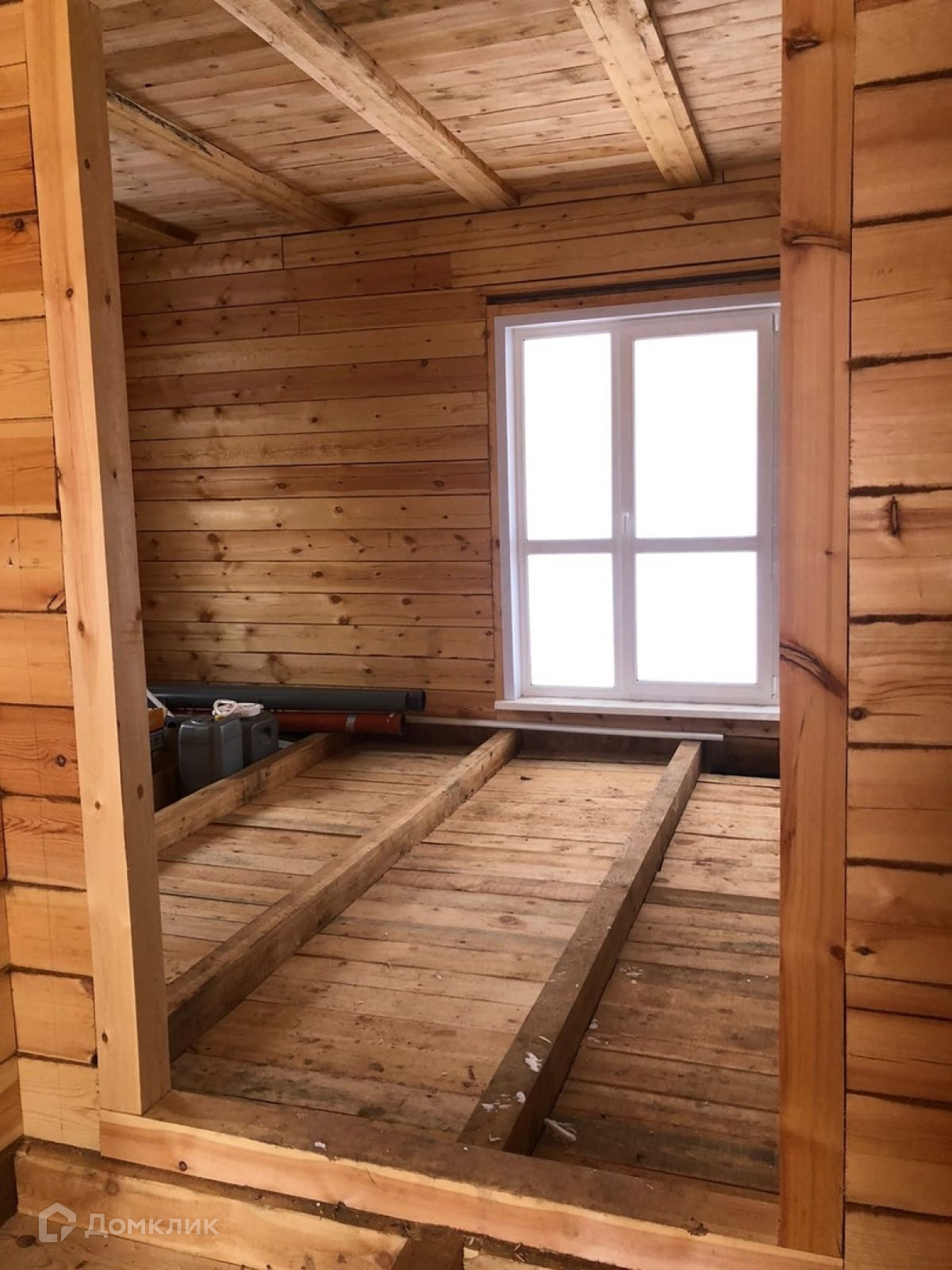 дом, брусовой, окна, двери есть, полы черновые, вода подведена в дом, комнаты разделены, 1 этаж гостиная с кухней, спальня, с/у ,фундамент под гараж, баня, участок огорожен.
