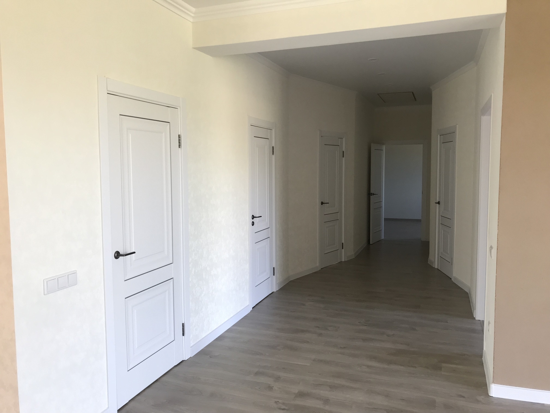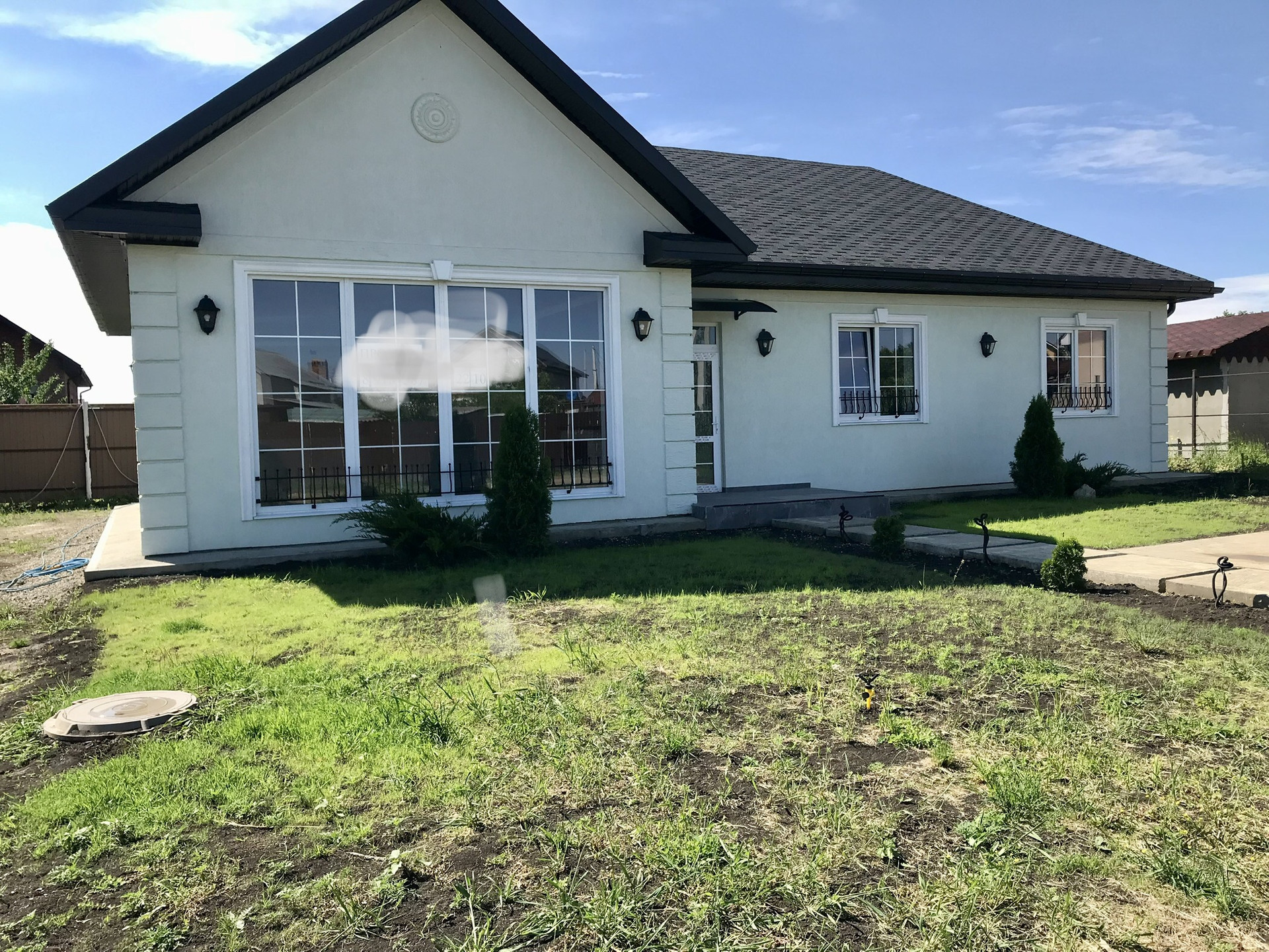 В доме на первом этаже три спальни, гардеробная, техническое помещение, санузел, большая светлая гостиная с панорамными окнами в пол, кухня с выходом на террасу. Высота потолков 3 метра.