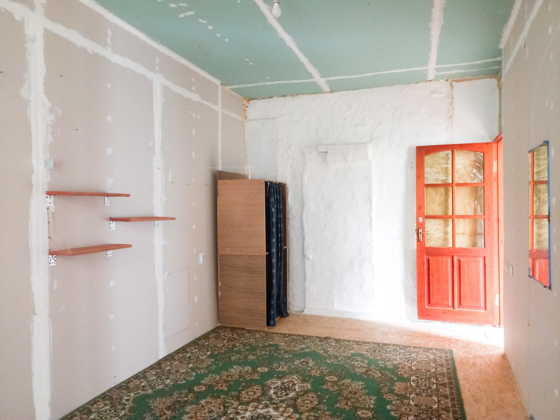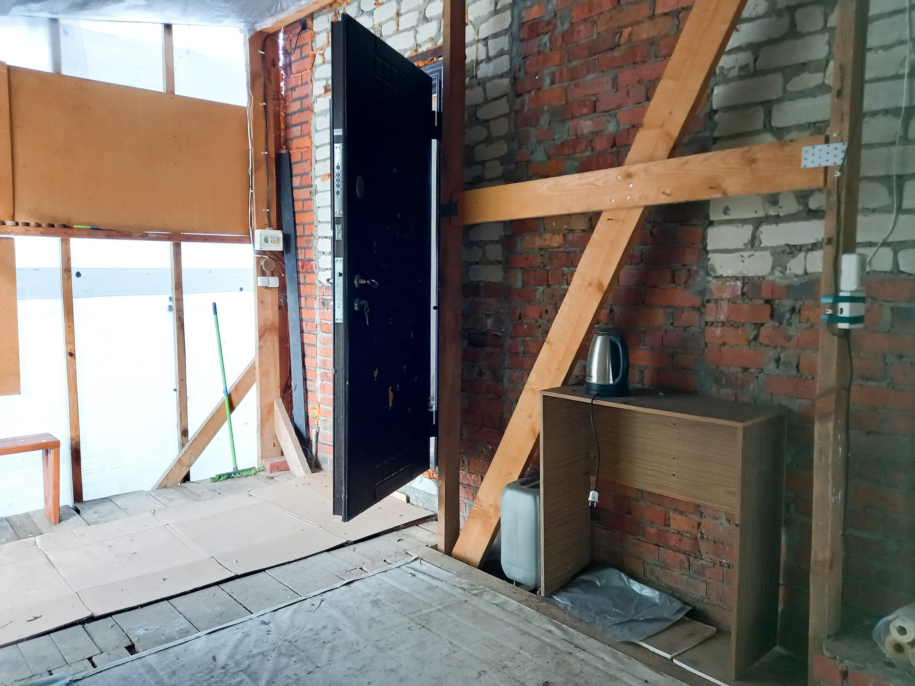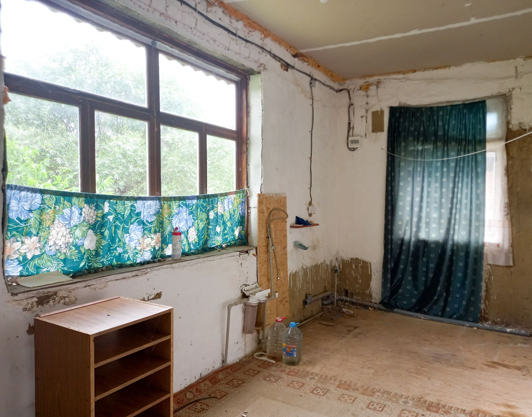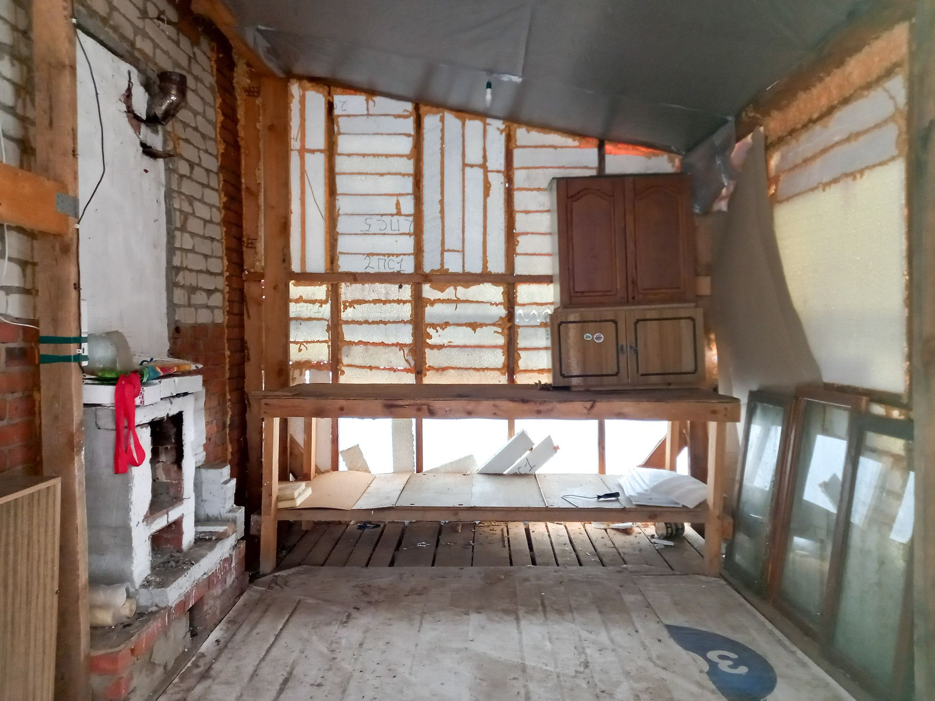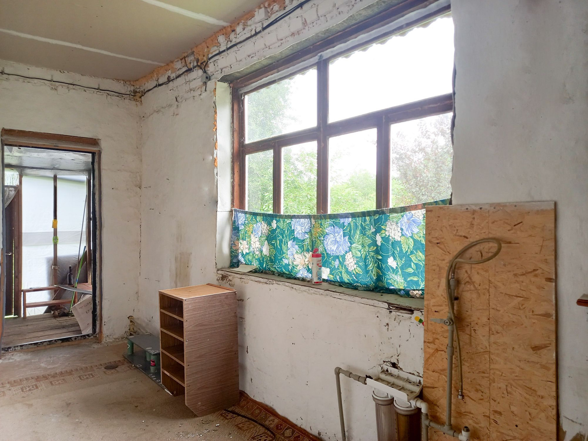 В доме прихожая,  кухня, комната, большая закрытая веранда