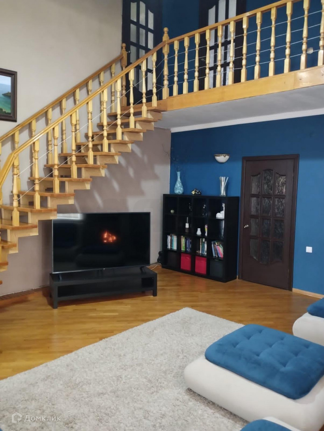 В доме большой холл высотой шесть метров, где и находится камин. Большая столовая с дубовым столом, удобная кухня, котельная. Мебель и бытовая техника полностью остаётся. На втором этаже четыре комнаты, туалет, кладовая. Также есть гараж на два автомобиля.