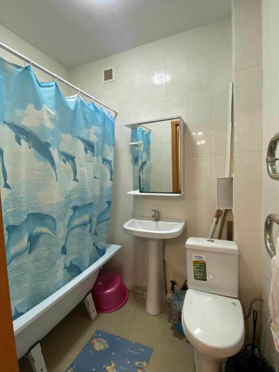 Сан. узел совмещен, отделан плиткой, установлена сан. техника.