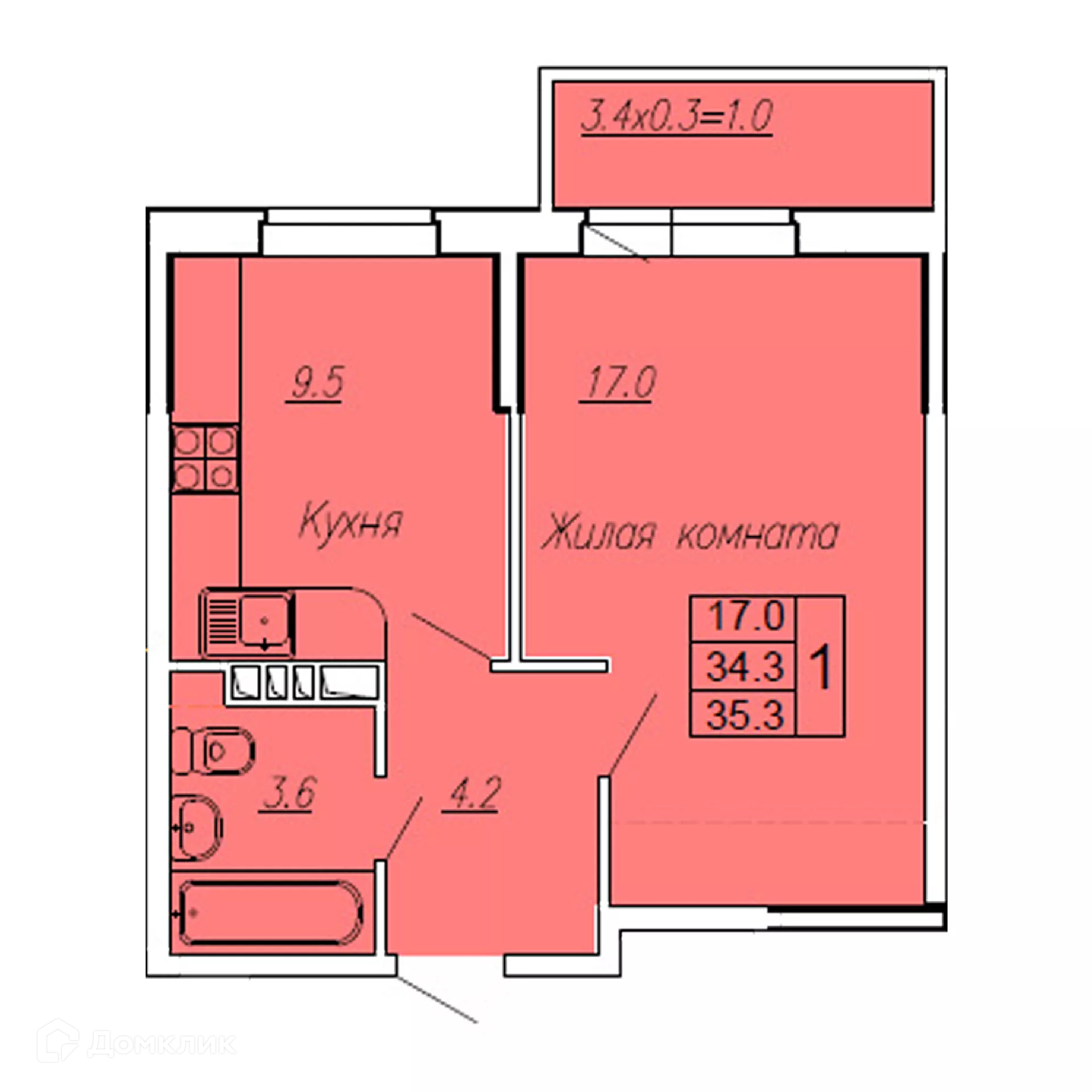 Общая площадь 35.3 м2