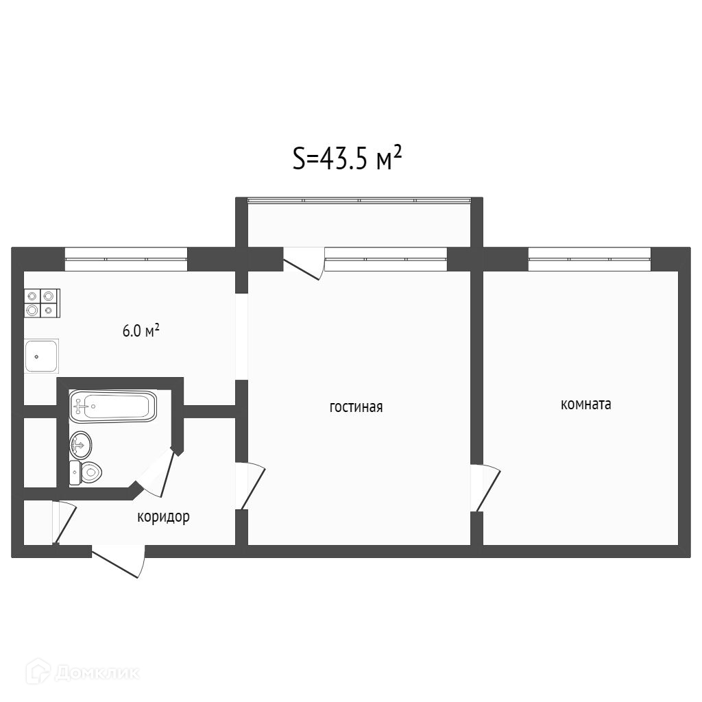 Общая площадь 43.5 м2