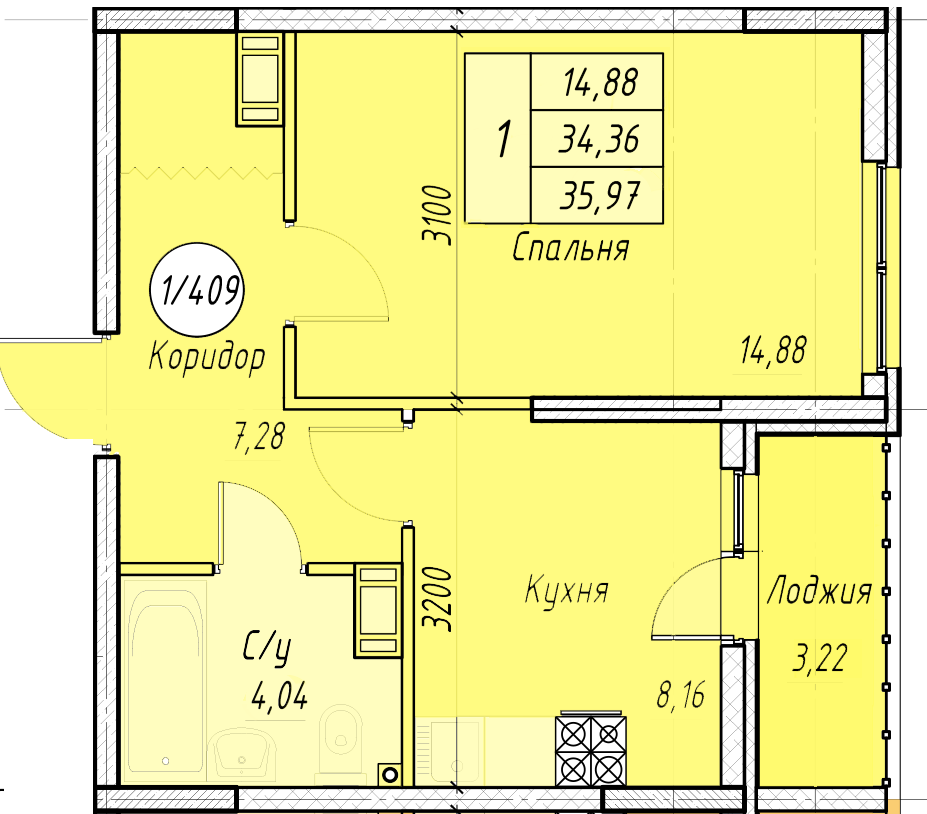 Общая площадь 35.82 м2