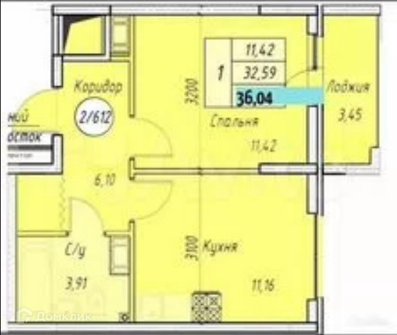 Общая площадь 36 кв.м., комната - 12 кв.м., кухня - 11 кв.м., есть лоджия.  Состояние квартиры - предчерновая отделка.
