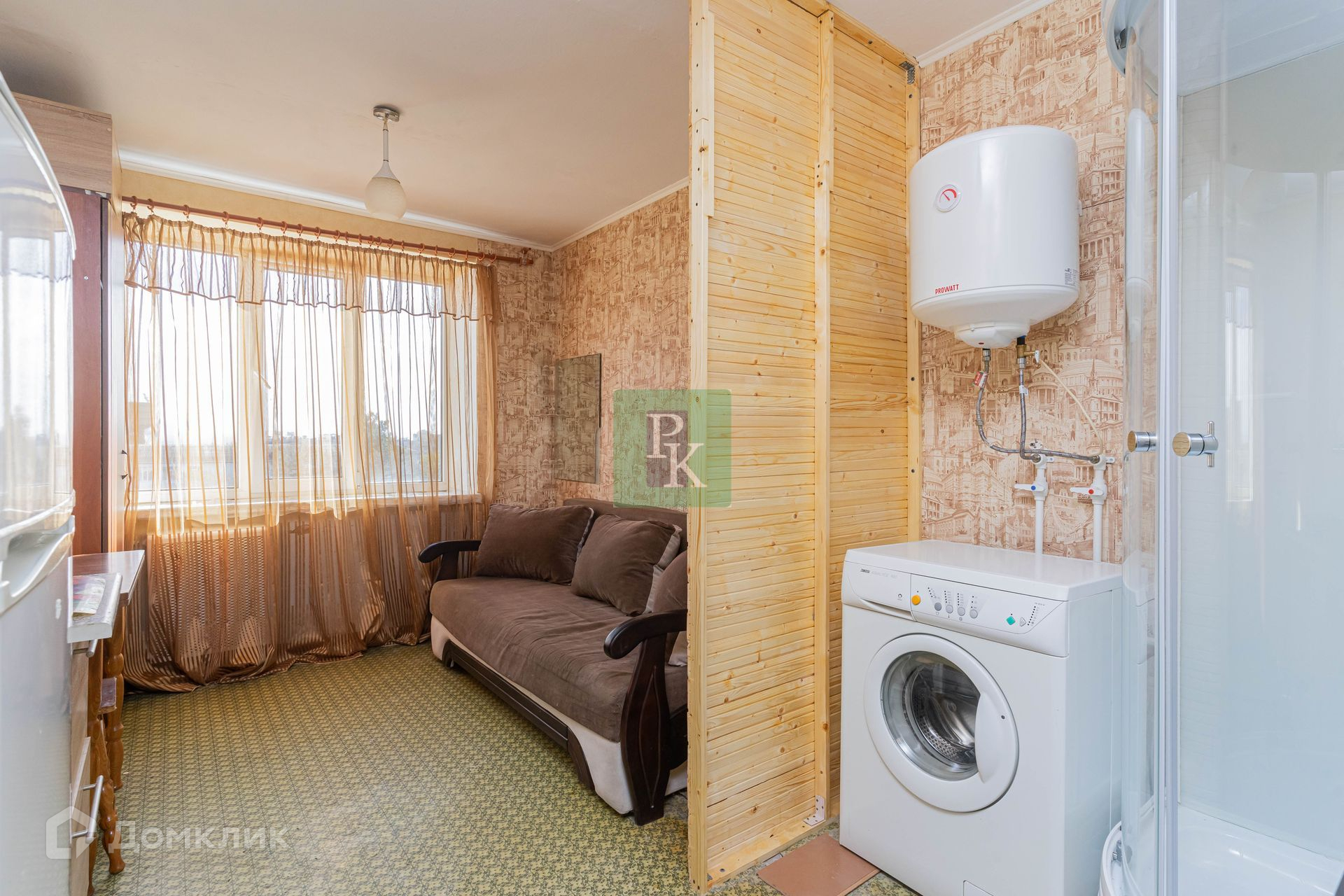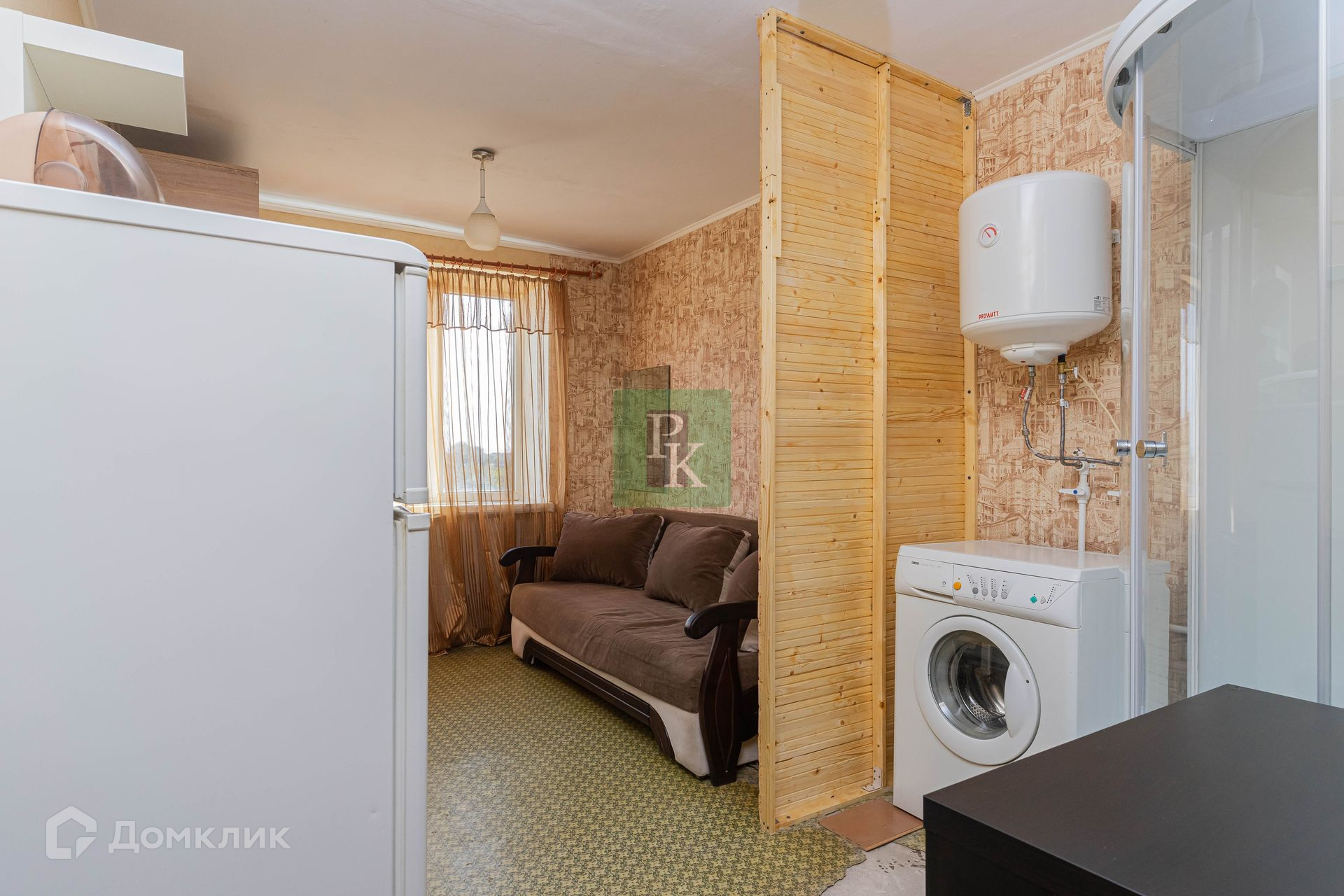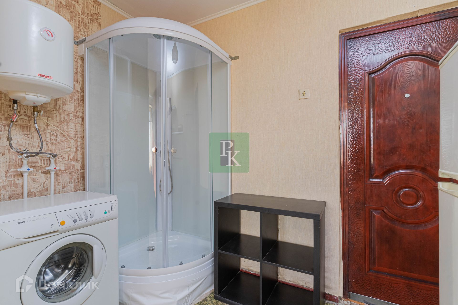 Также в комнате установлена новая душевая кабина, стиральная машинка, холодильник.