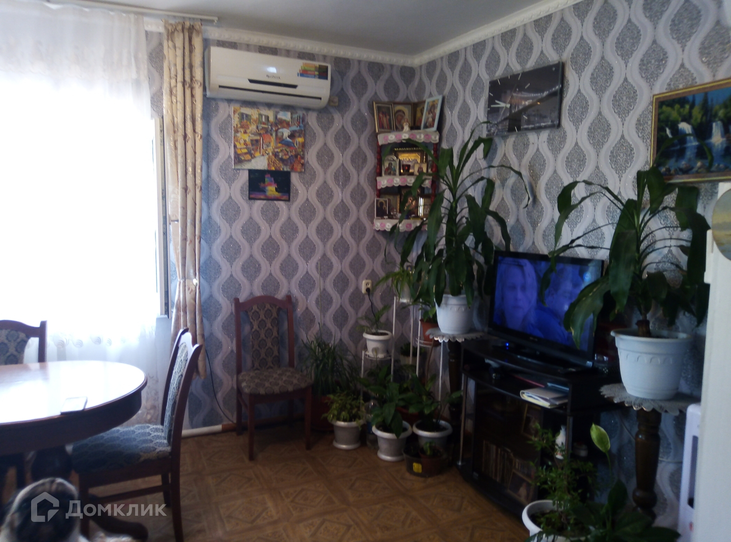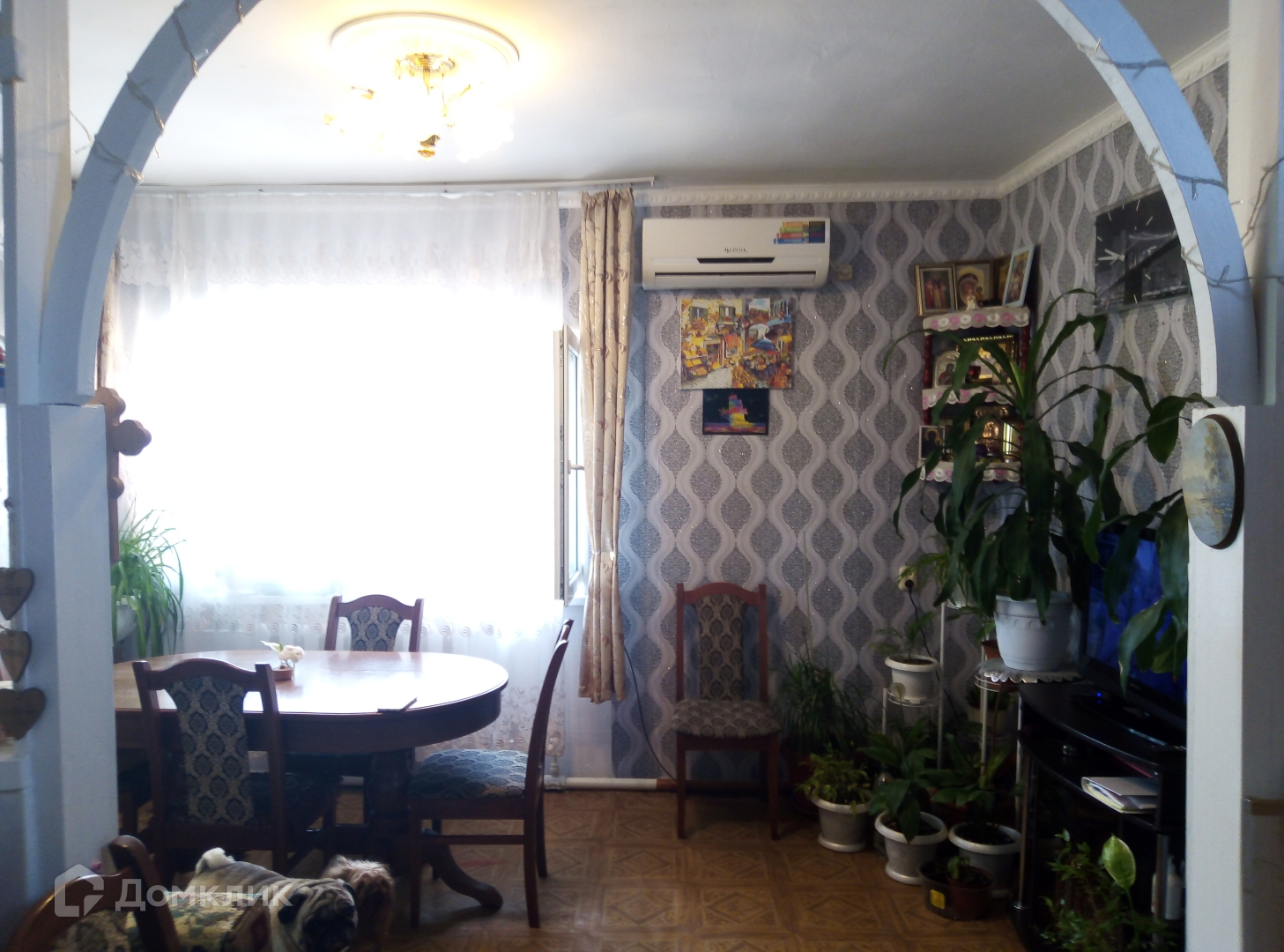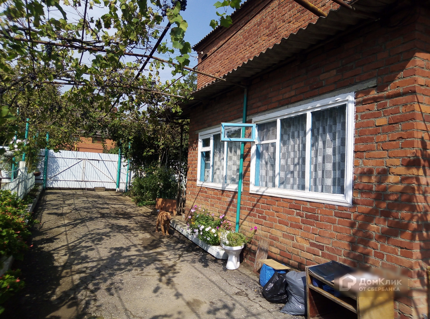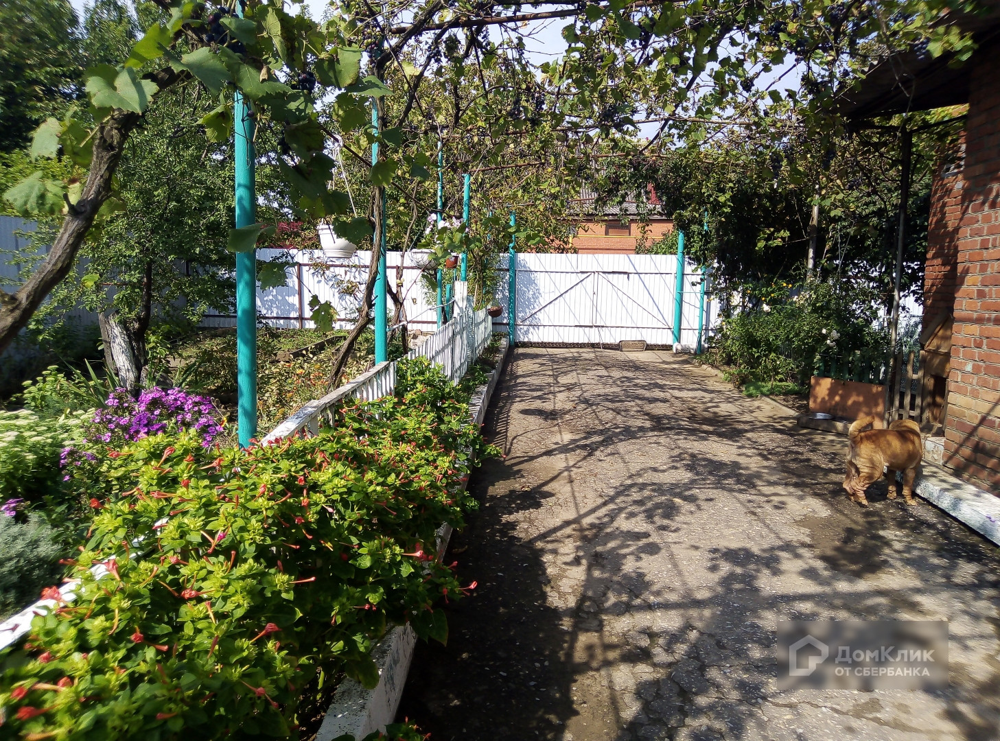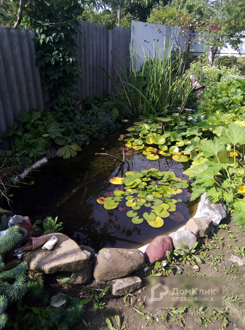 Двор дома ухожен, перед входом в дом посажены цветы и разбит пруд с водяными лилиями.