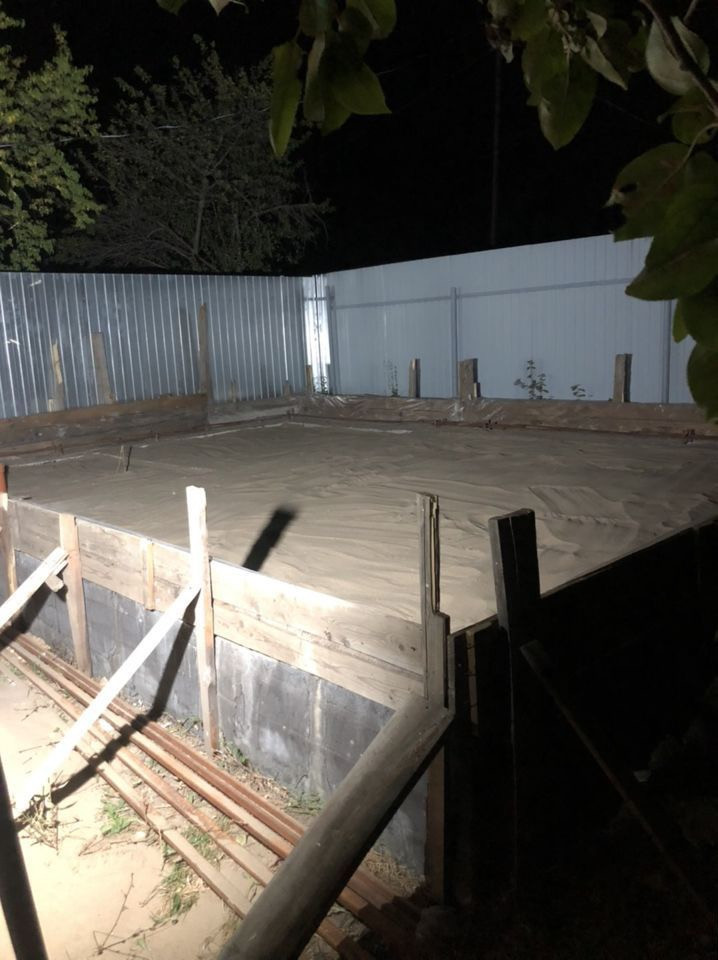 На участке также капитальный фундамент 5*7м (под баню или капитальный дом). Фундамент ростверк армированный, подведены канализация, водяная труба под скважину, сверху залита монолитная плита.
