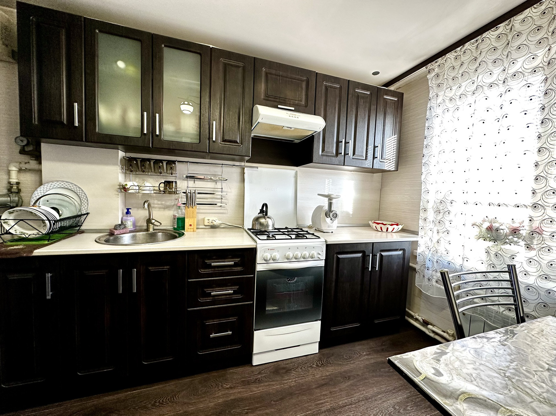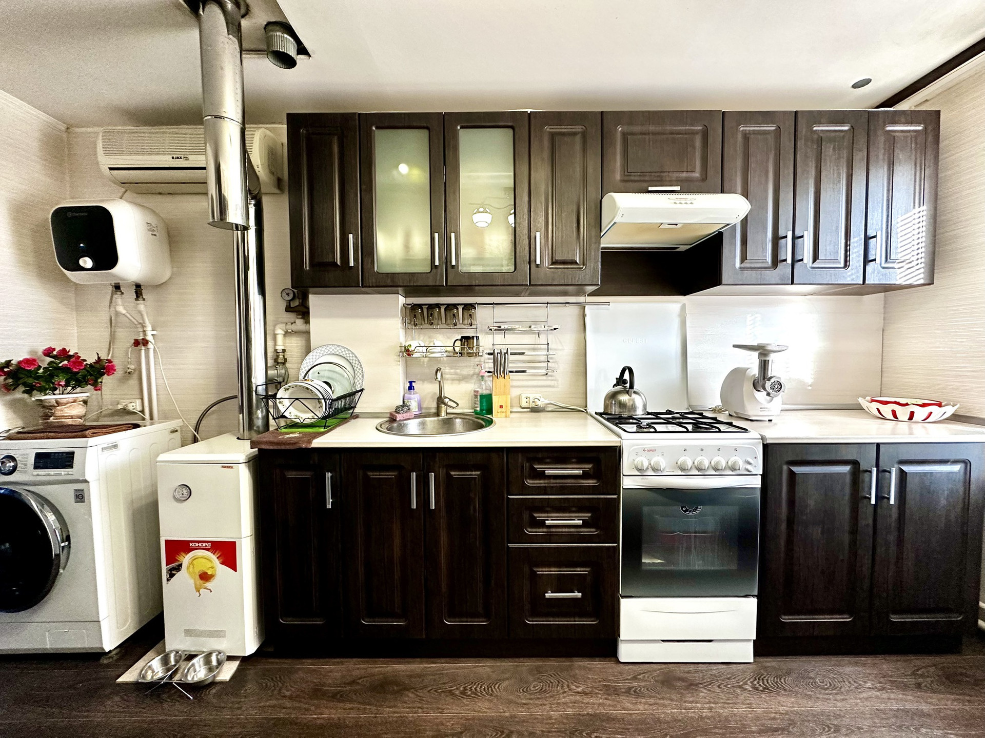 Дом полностью функционирующий, все коммуникации подключены: центральное электро и газоснабжение, центральный водопровод, канализация- выгребная яма. Дом очень теплый, установлен новый напольный газовый котел, все окна ПВХ, санузел в доме, все очень аккуратно и чисто.