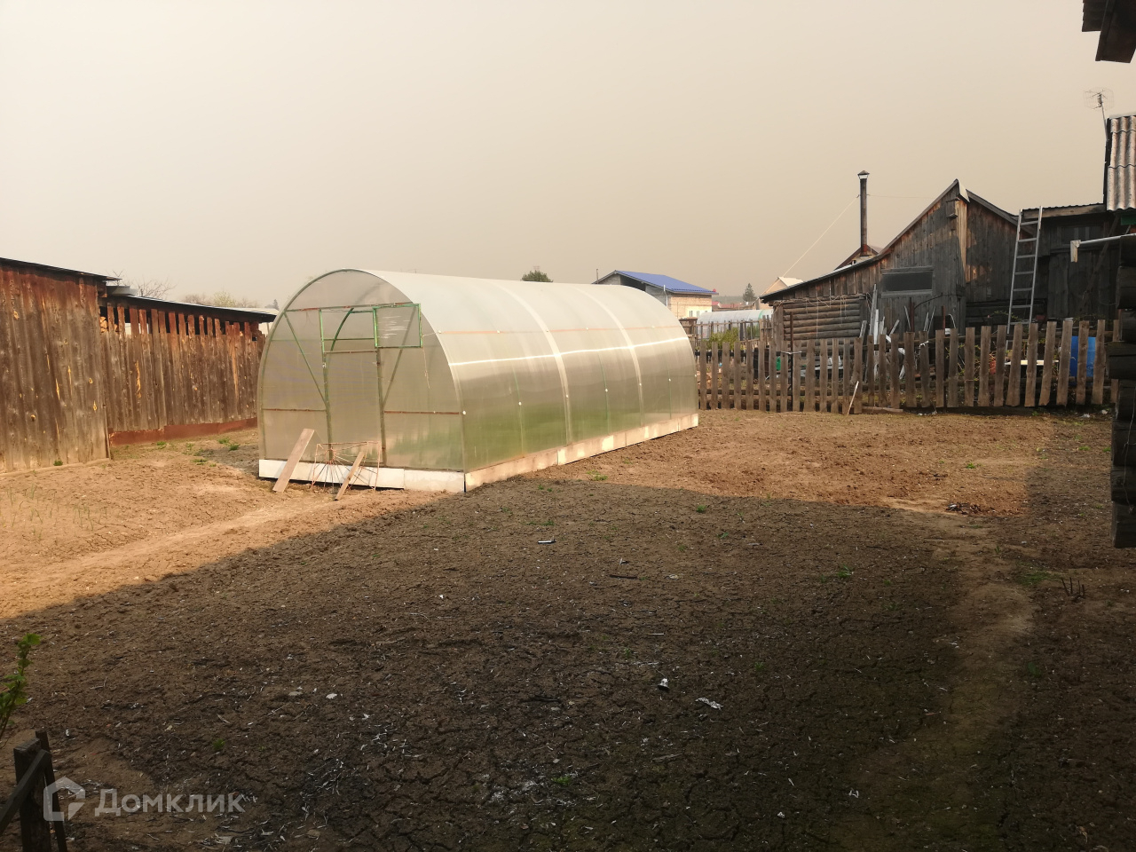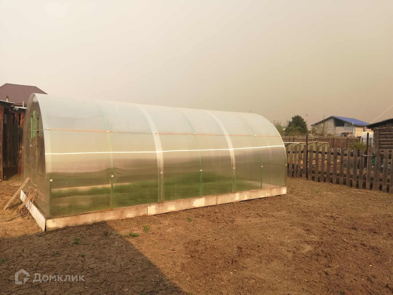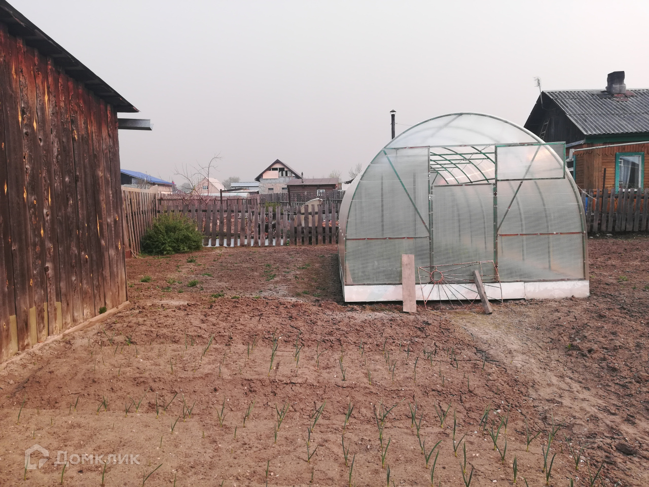 В огороде теплица из  поликарбоната. Огород посажен.