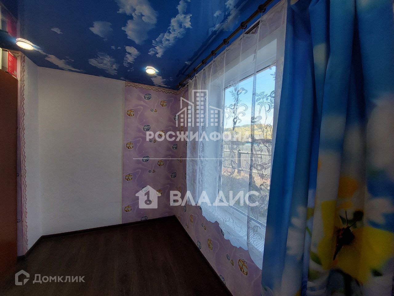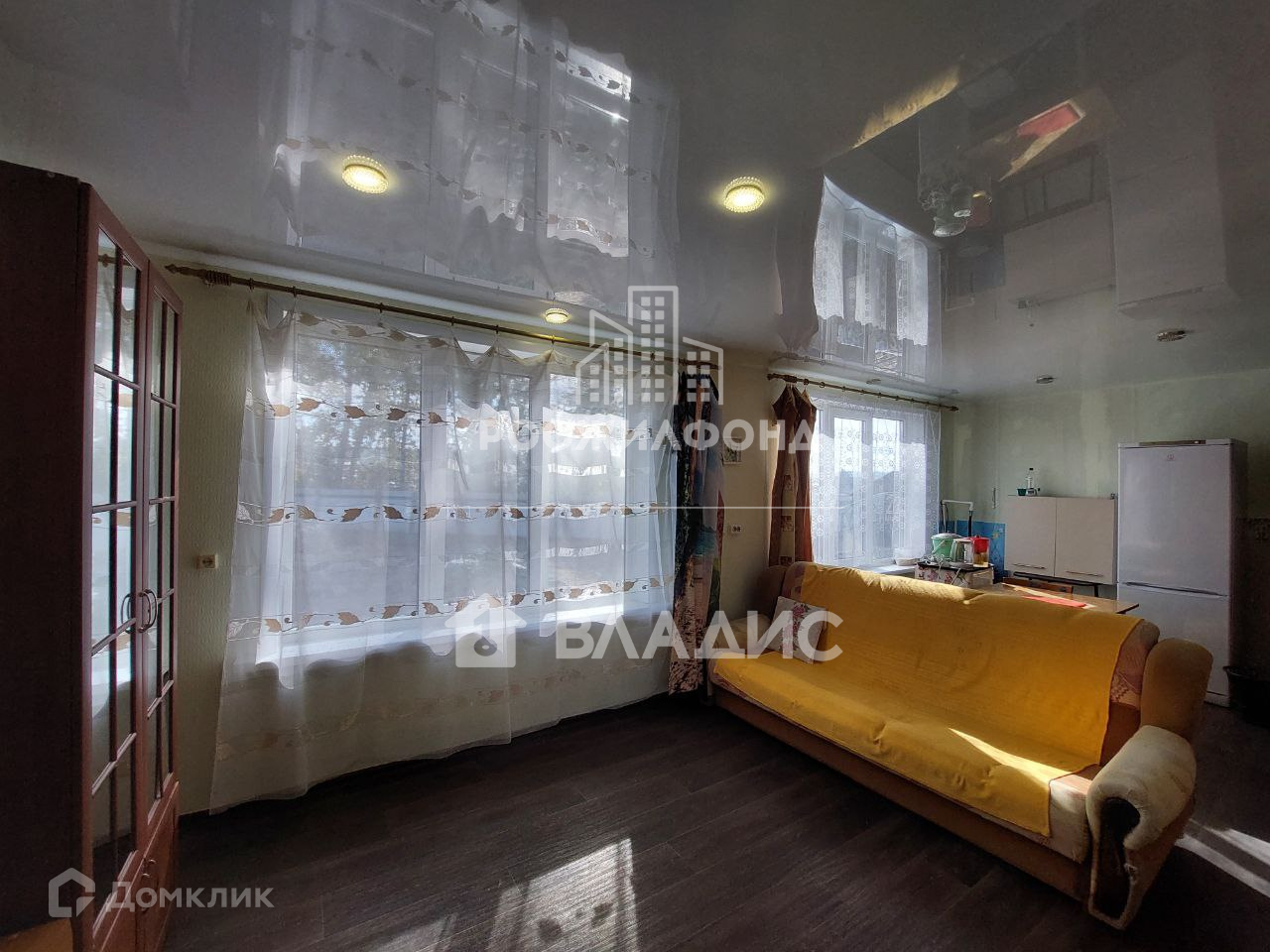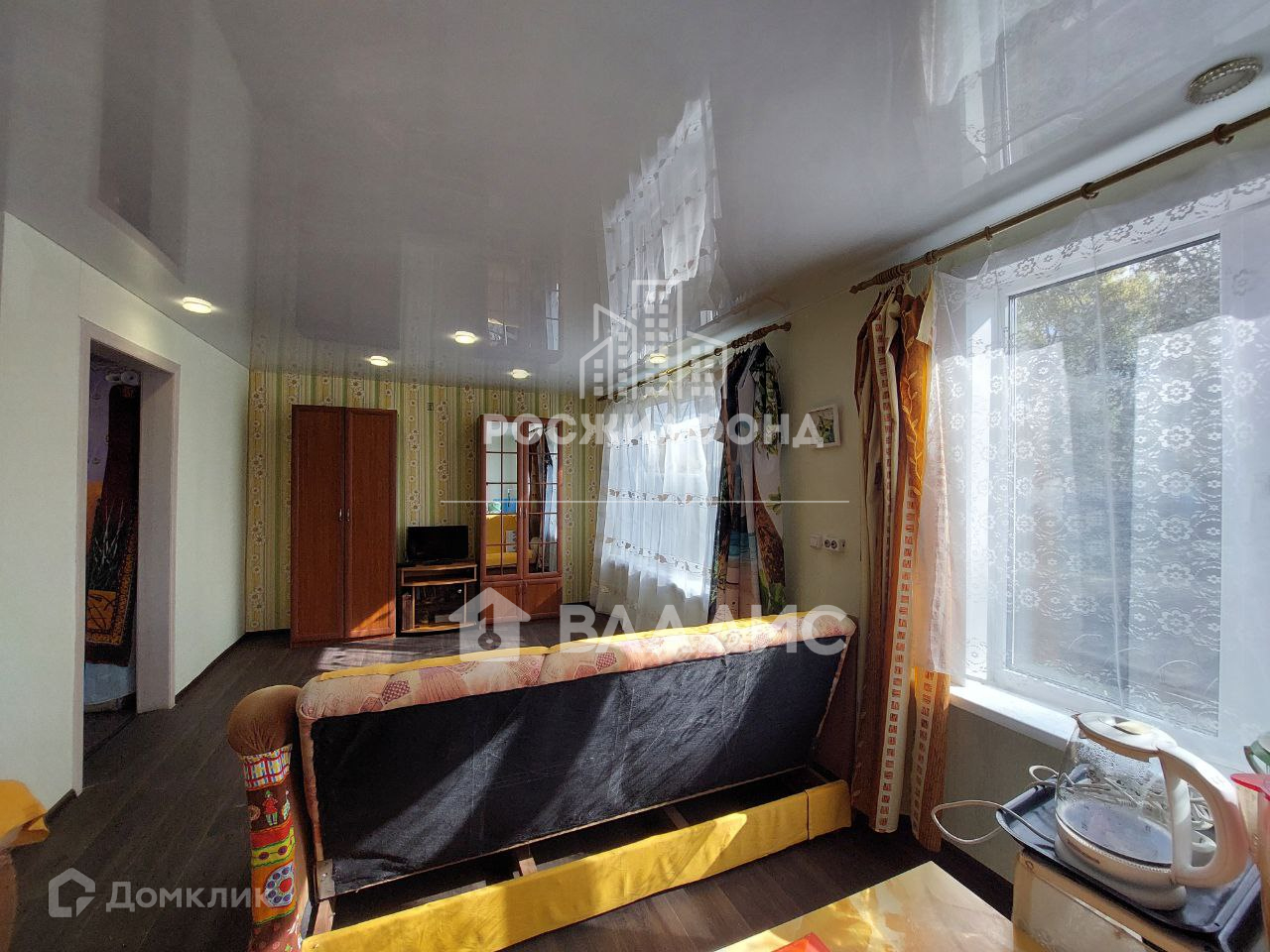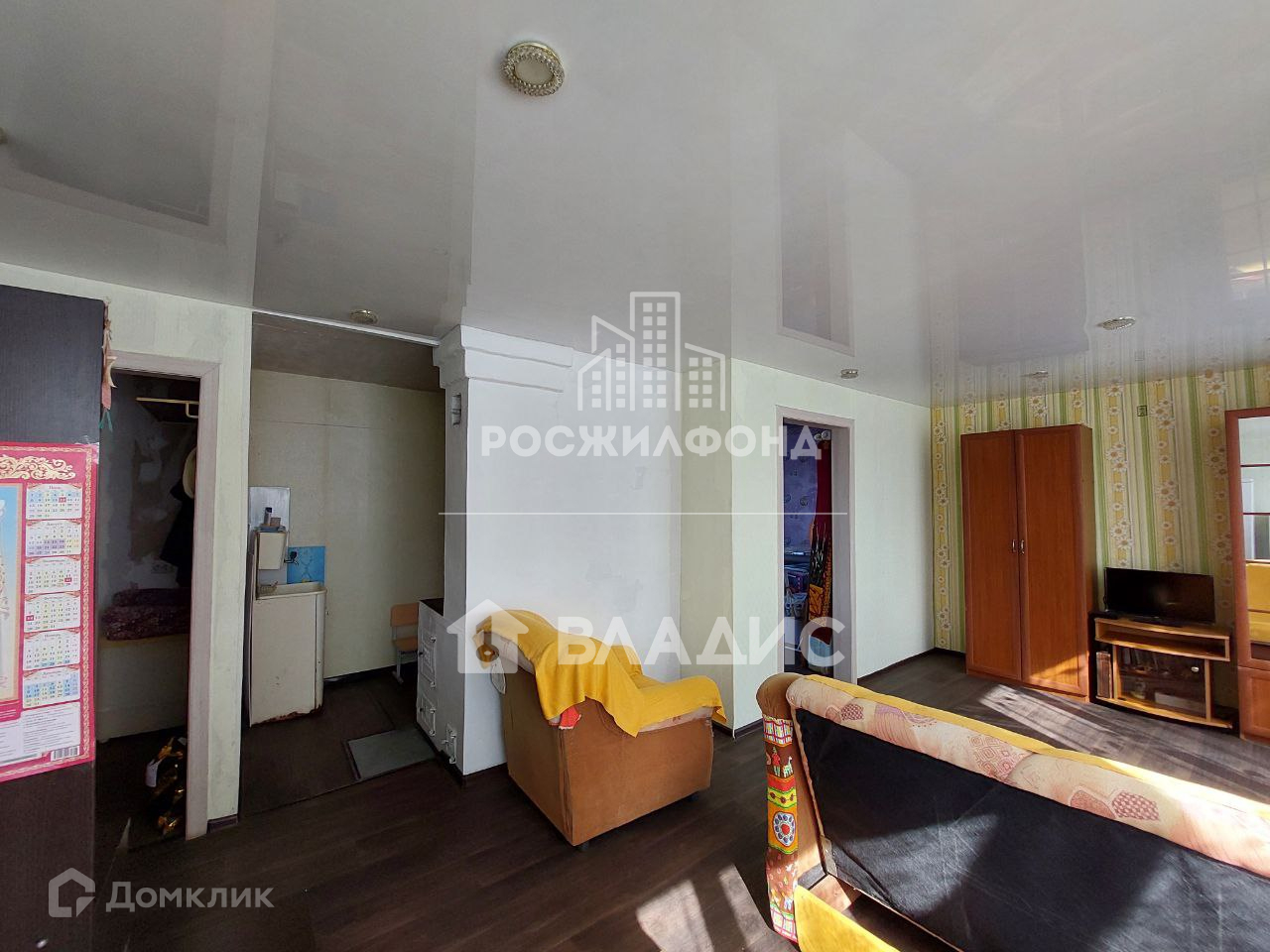 На полу линолеум с утеплителем. На стенах обои. Потолки натяжные.