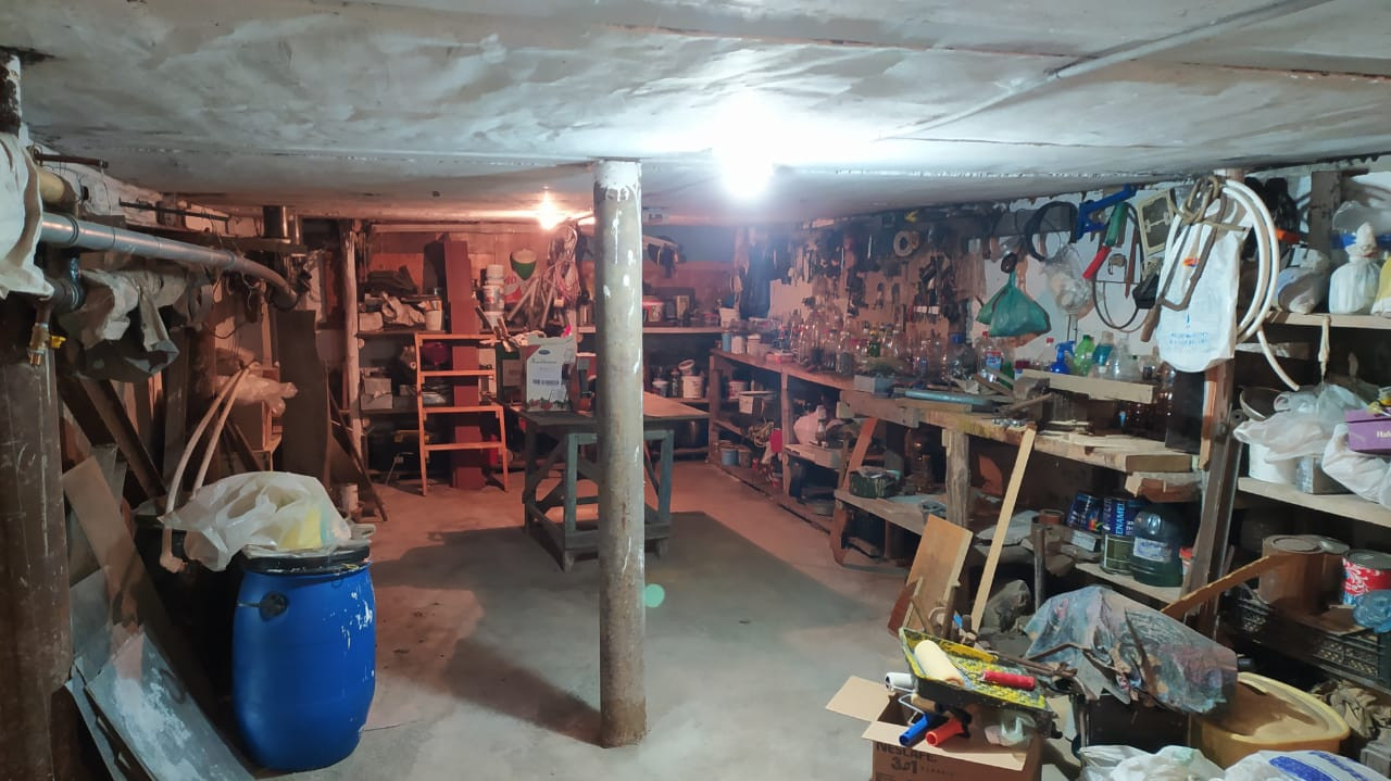 Подвал под всем домом с овощехранилищем и мастерской.
