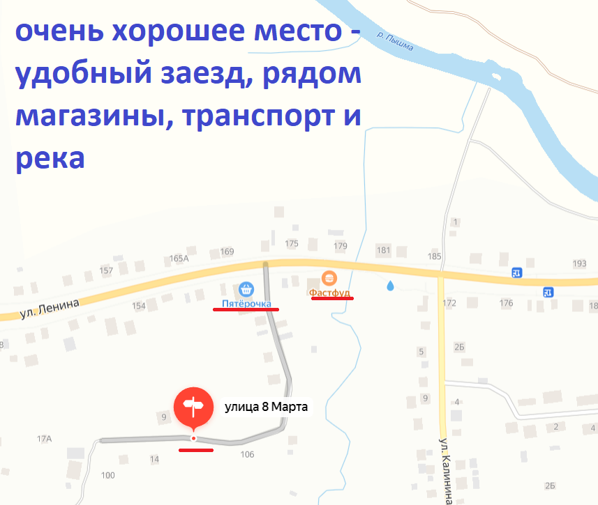 Пгт. Белоярский ул. 8 Марта 13 – очень хорошее место – рядом все необходимое -магазины, инфраструктура развита. Участок ровный, правильной формы на тихой улице. В поселке богатая инфраструктура, магазины, детский сад, школа, поликлиника и др. Часто ходят автобусы в Екатеринбург. Ехать максимум 40 минут от Екатеринбурга, 35 км от ЕКАД. Соседи добрые и приветливые.