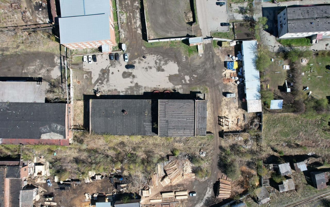 К производственному помещению проложены шпалы для обеспечения подхода к зданию железнодорожного транспорта.