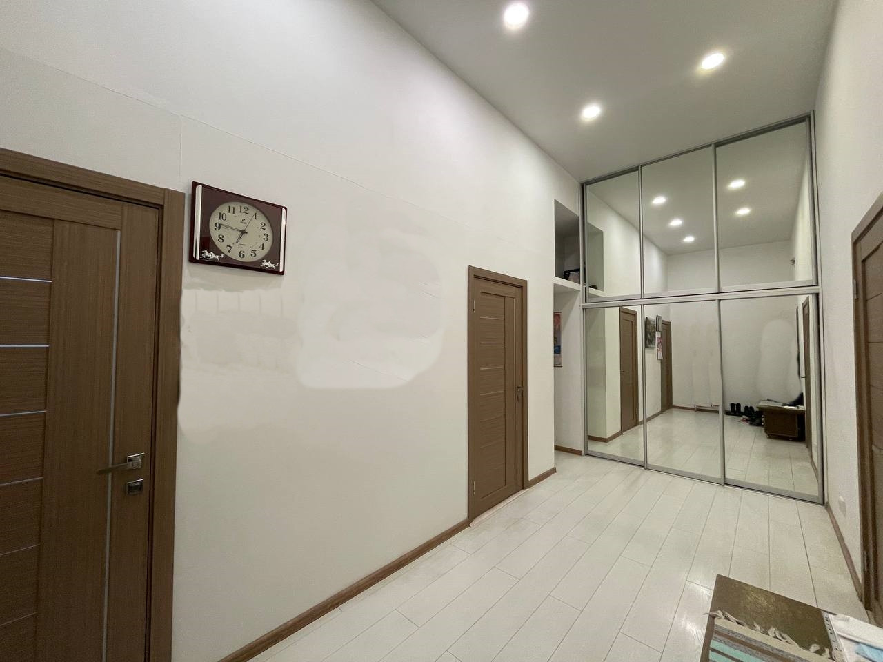 - Просторный холл, в котором установлены двухъярусные встроенные зеркальные шкафы (с ними Вам не потребуются дополнительные места хранения).