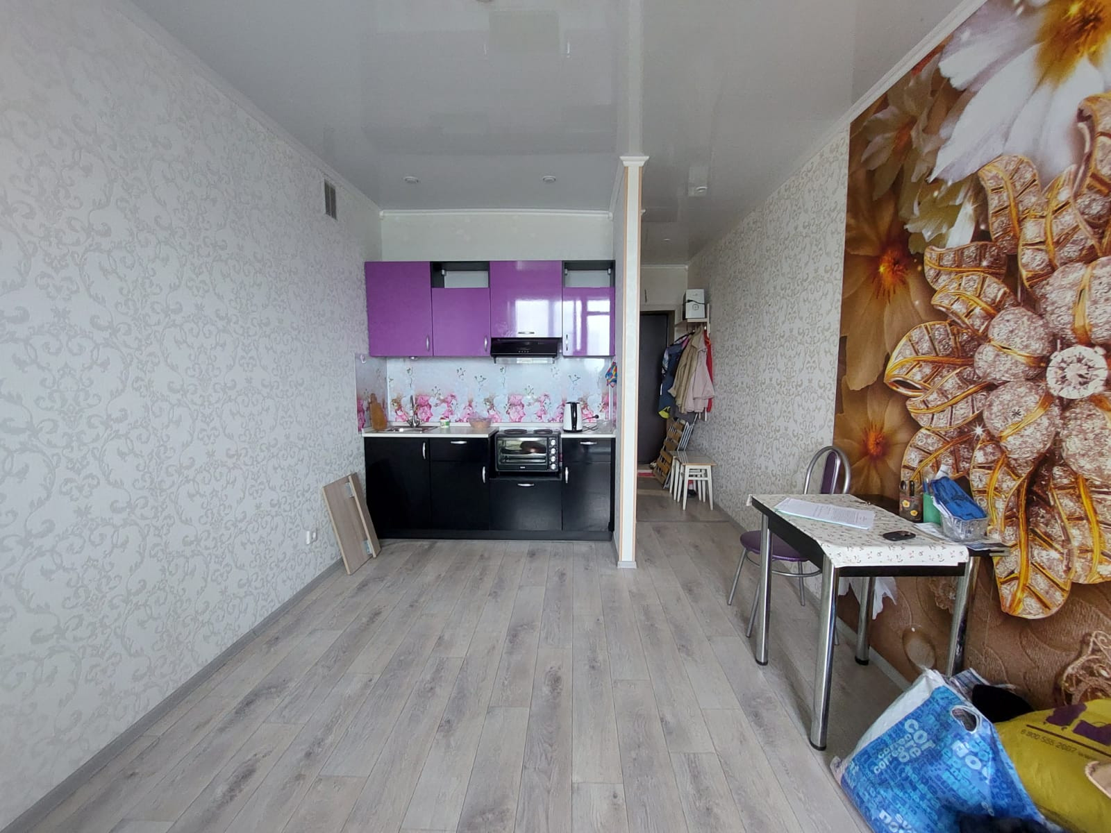 Состояние квартиры хорошее, пластиковые окна, балкон застеклен, напольное покрытие линолеум, натяжные потолки с точными светильниками. Санузел совмещенный кафель (водонагреватель).