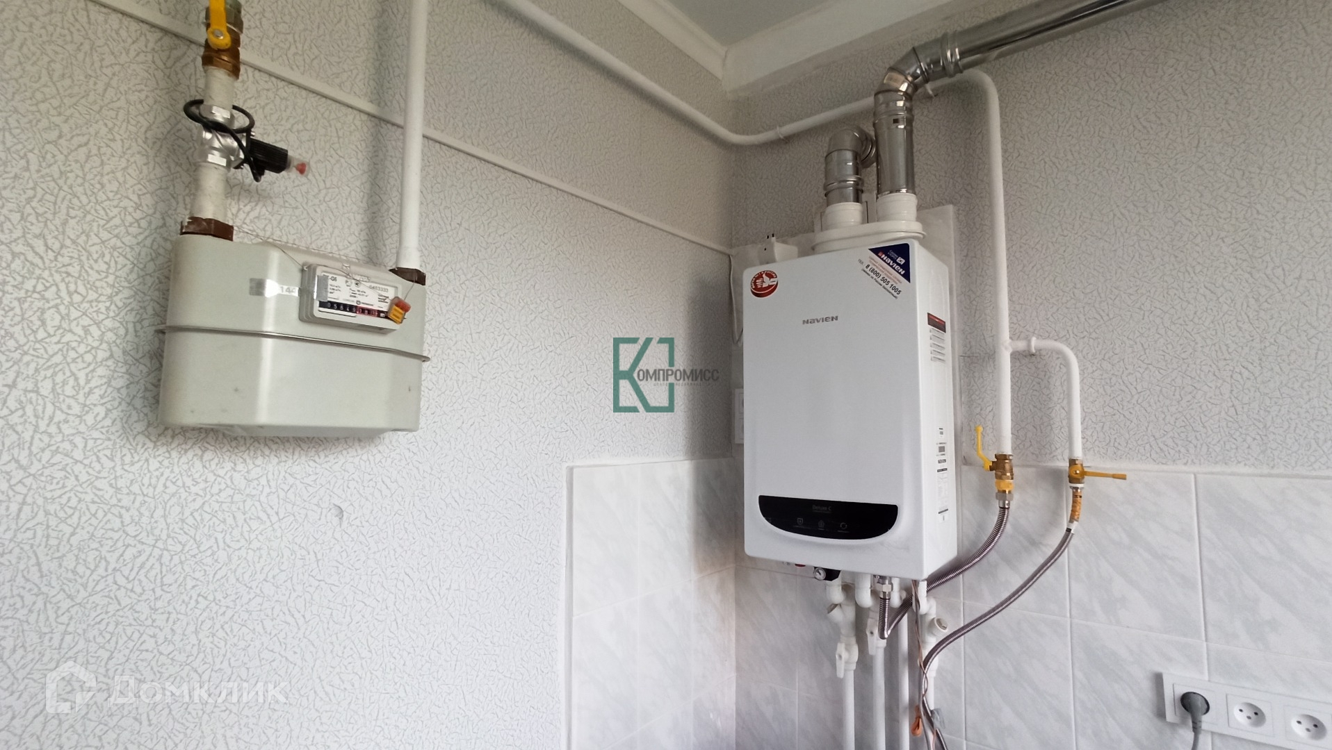Отопление и горячая вода индивидуальные, установлен двухконтурный котёл Навиен.