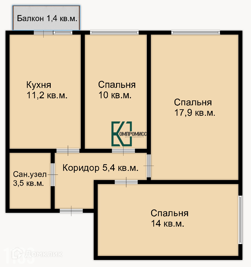 В квартире 3 спальни, прихожая, кухня, санузел, коридор.