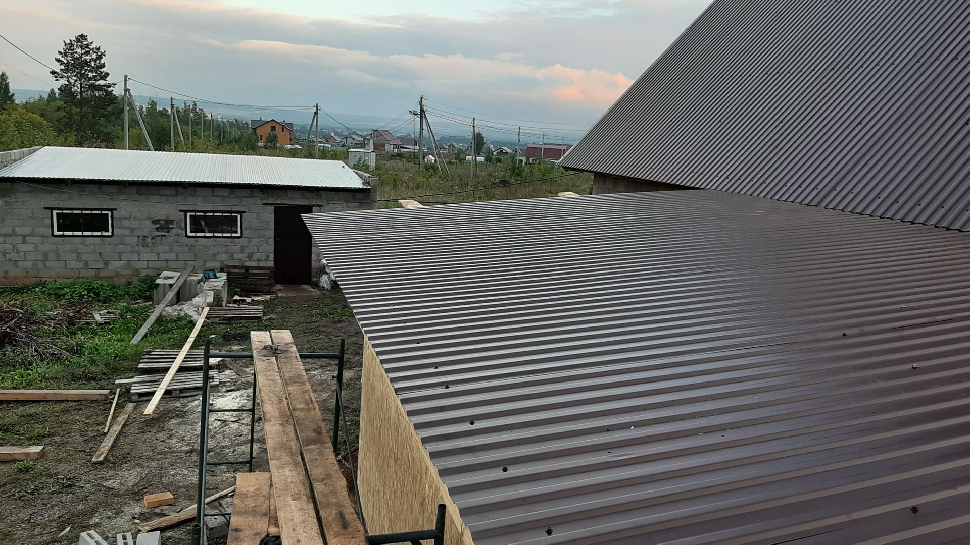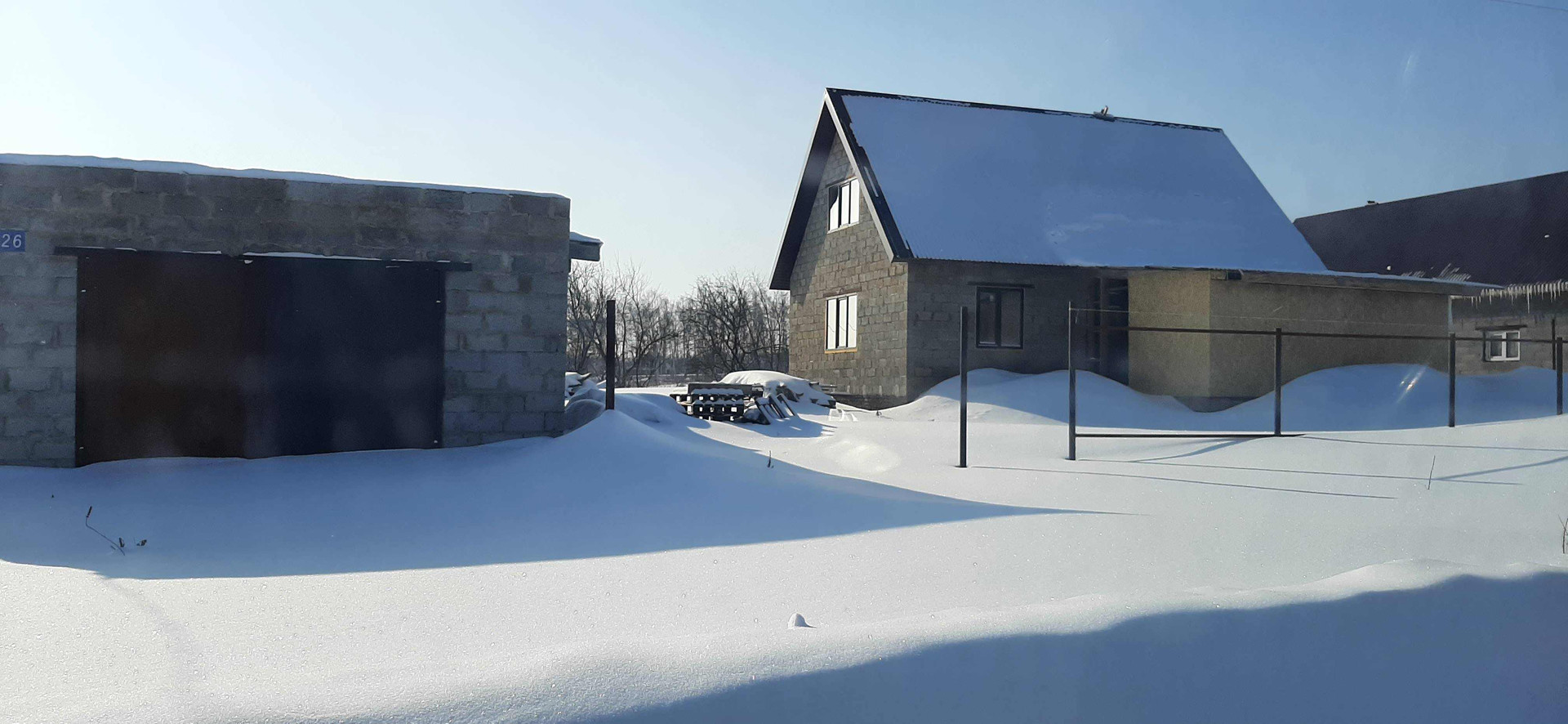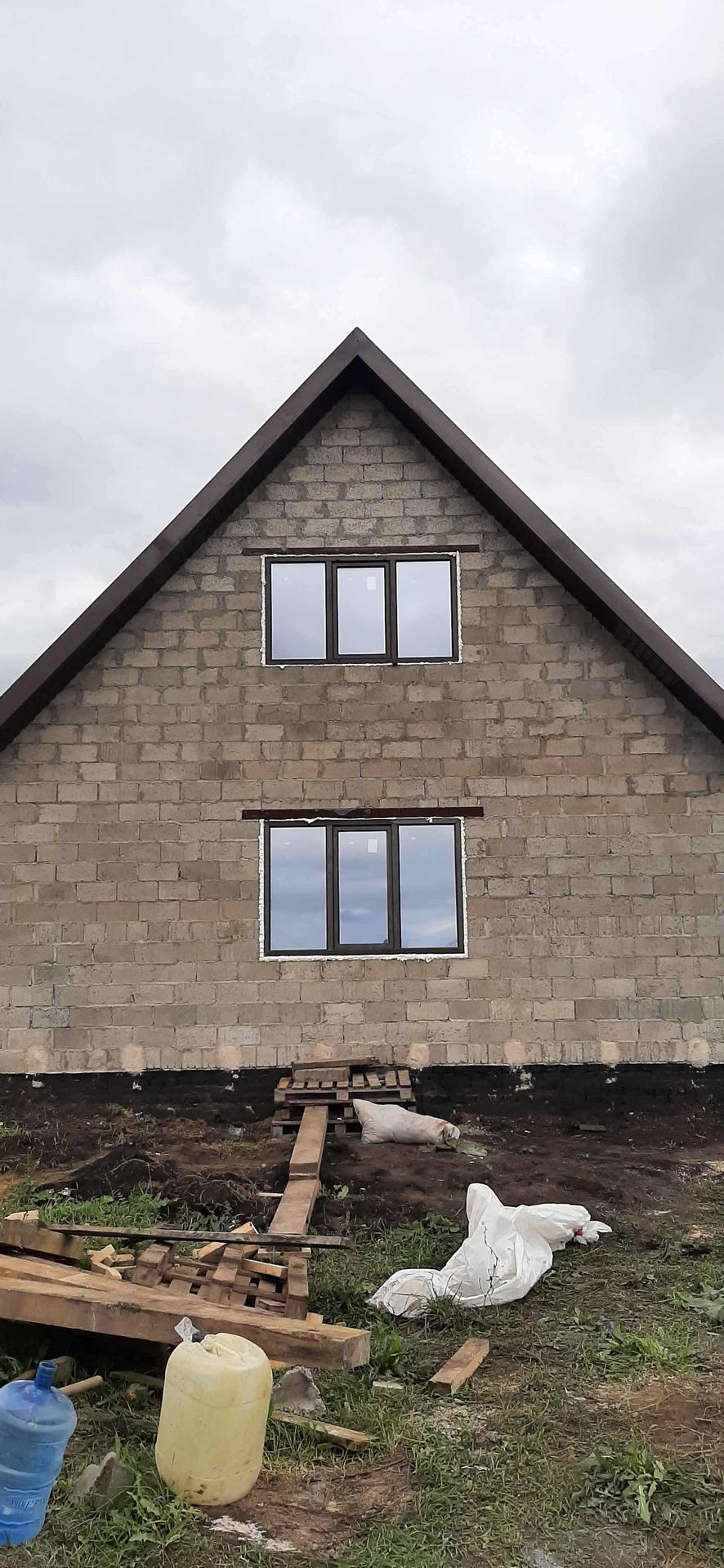дом (7*10) из шлакоблока. Чистовая  отделка выполнена частично. Проведёно электричество, под пристроем погреб. Территория частично огорожена. По улице проведена газовая труба. Гараж 5*8 из шлакоблока. Канализация.